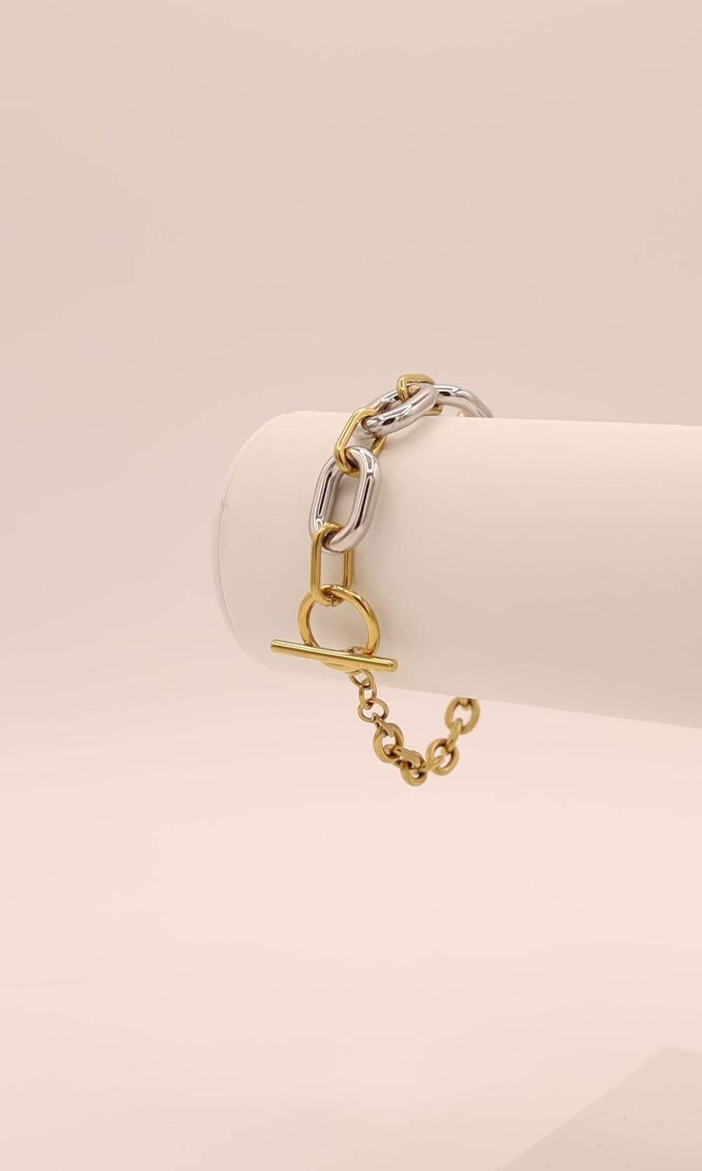 Obsessed with this statement piece! This two-tone bracelet with chain detailing can be a perfect addition to your outfit!