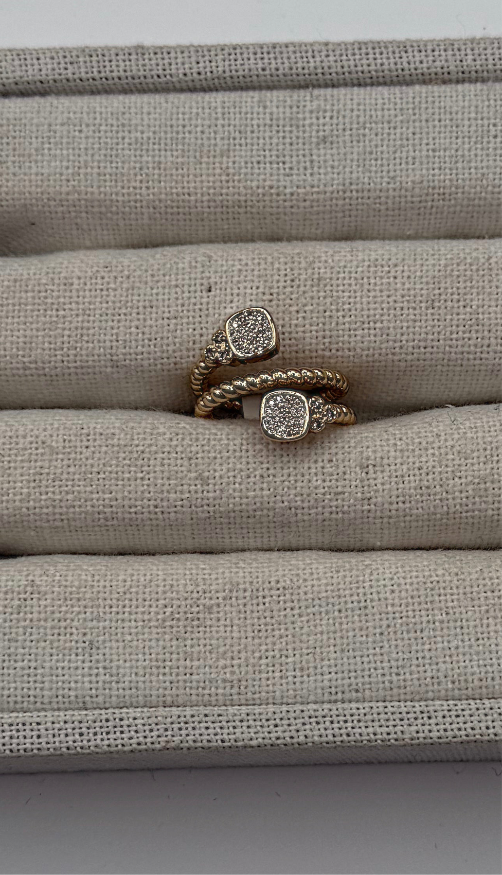 Gold wrap ring with two crystal studs. Braided band.