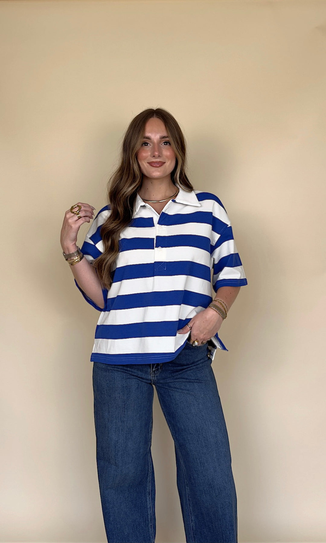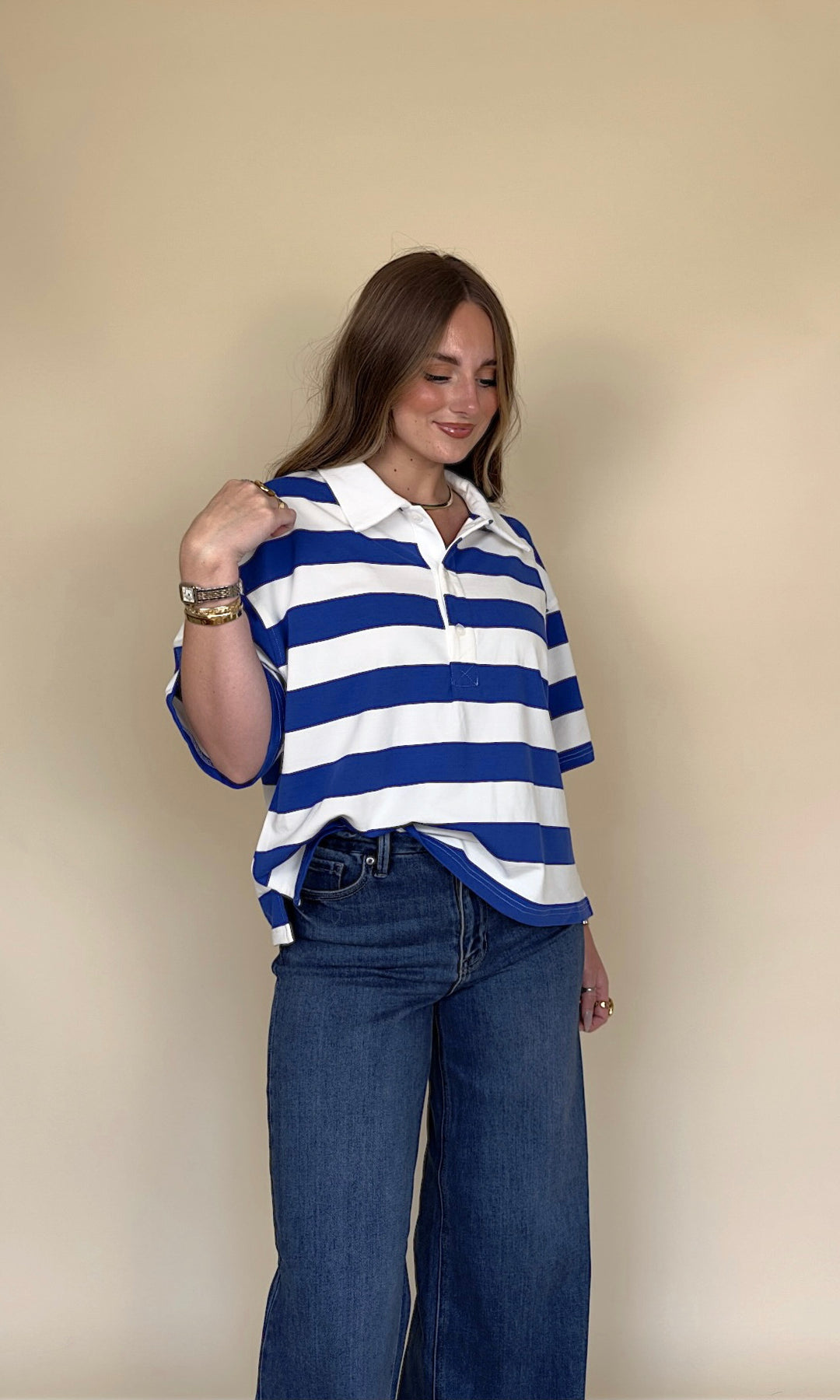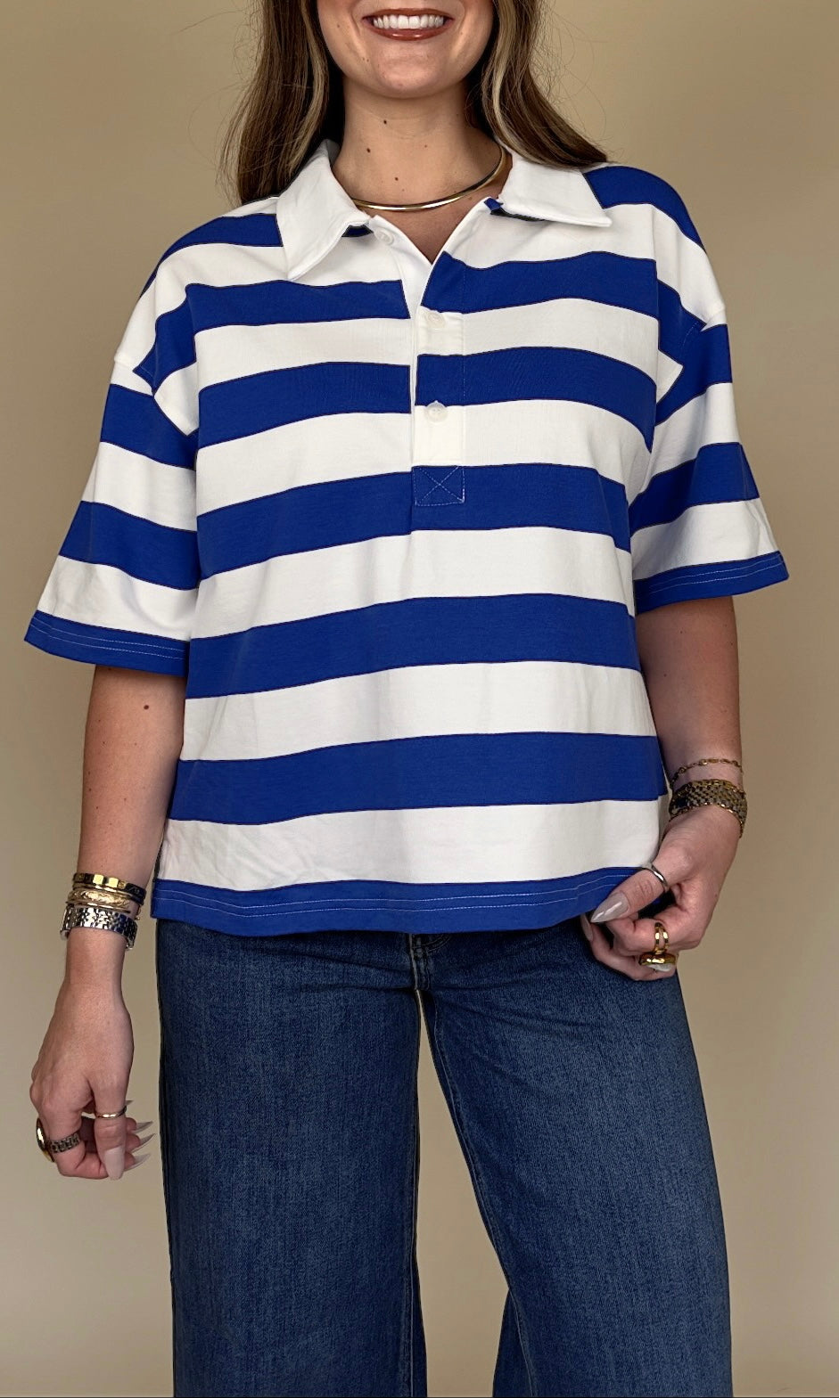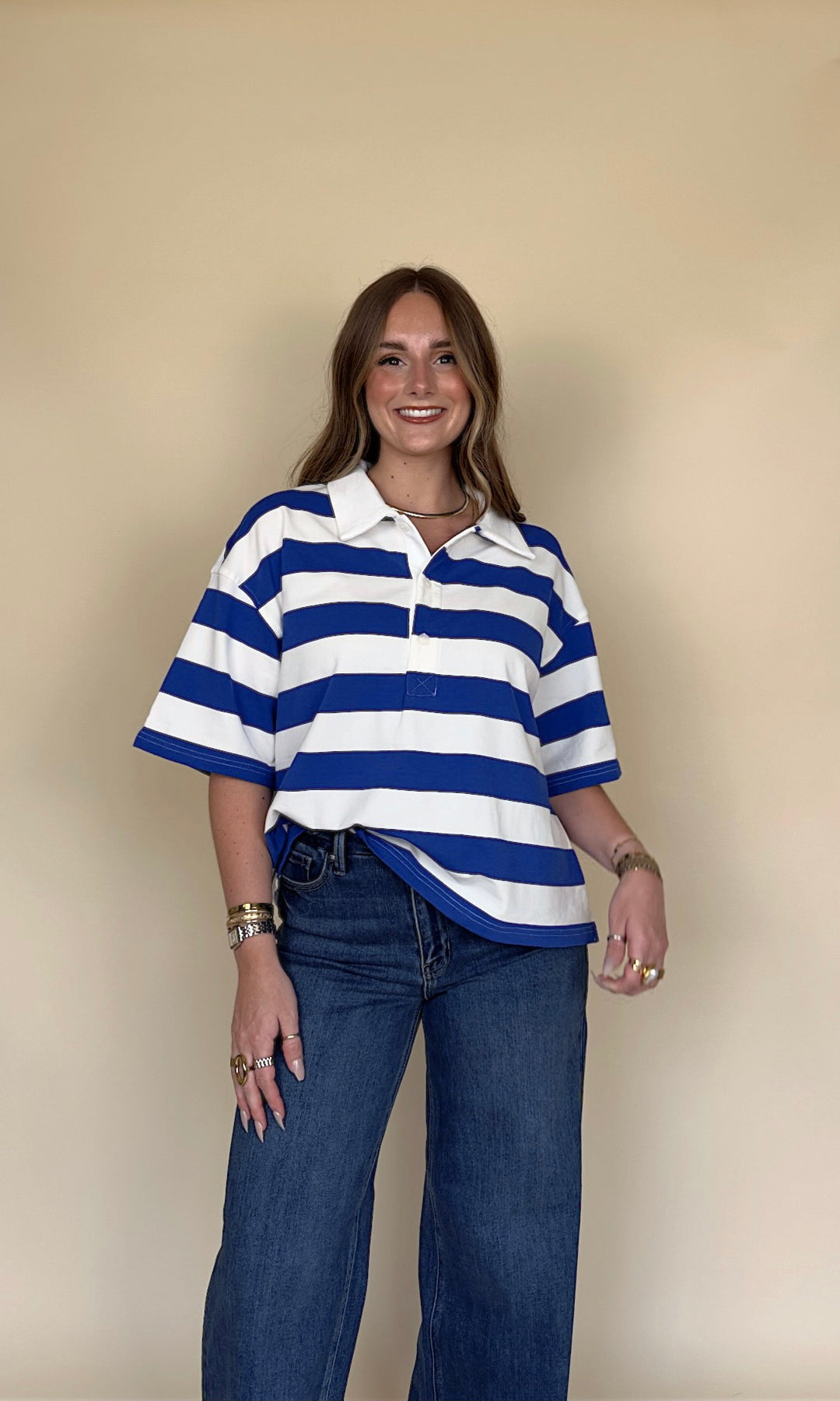 The perfect piece for gameday... this oversized collared shirt with blue and white stripes would be SO cute with baggy jeans!