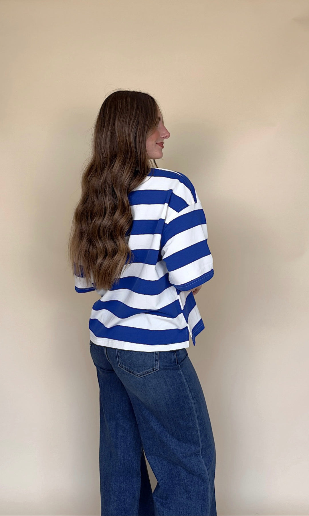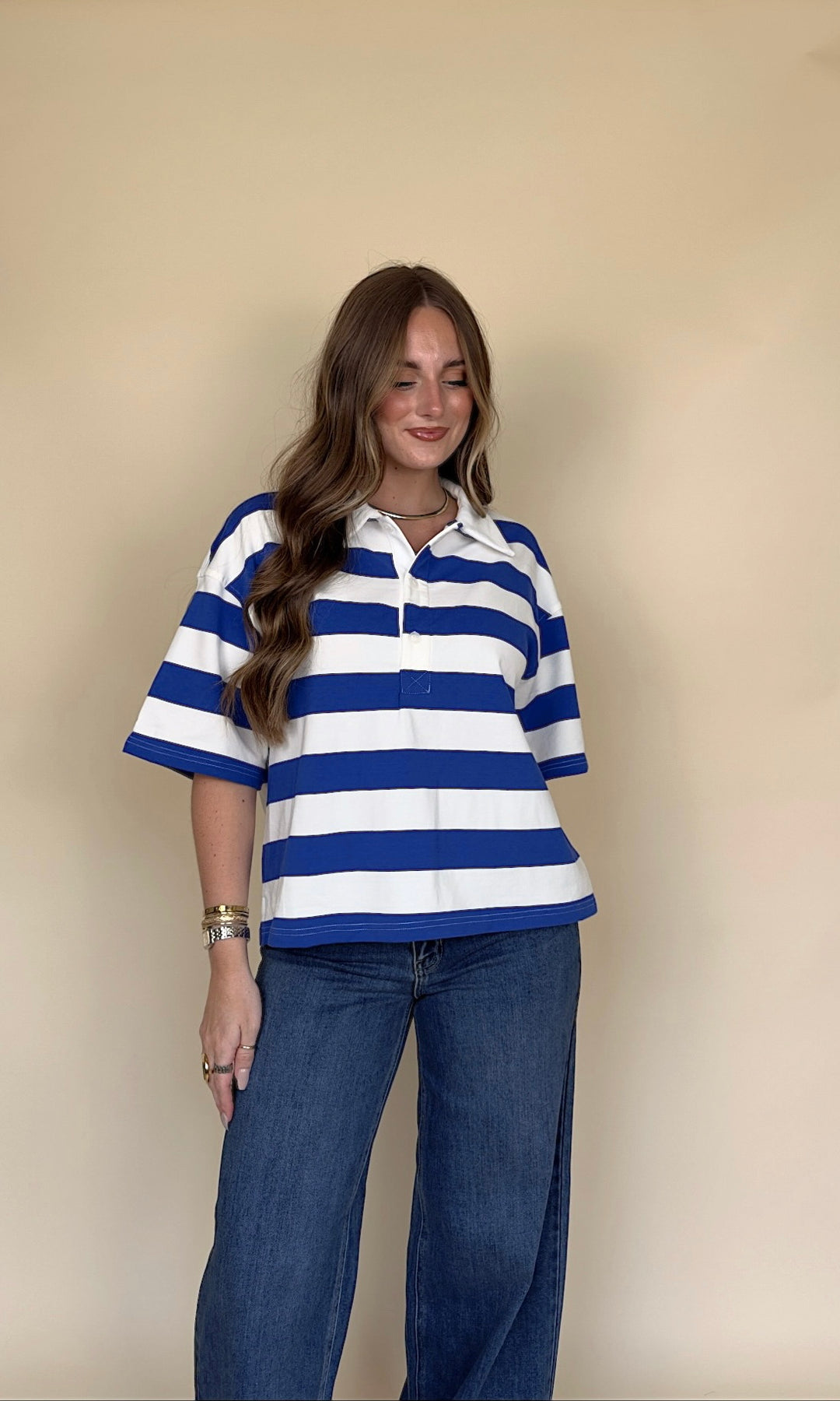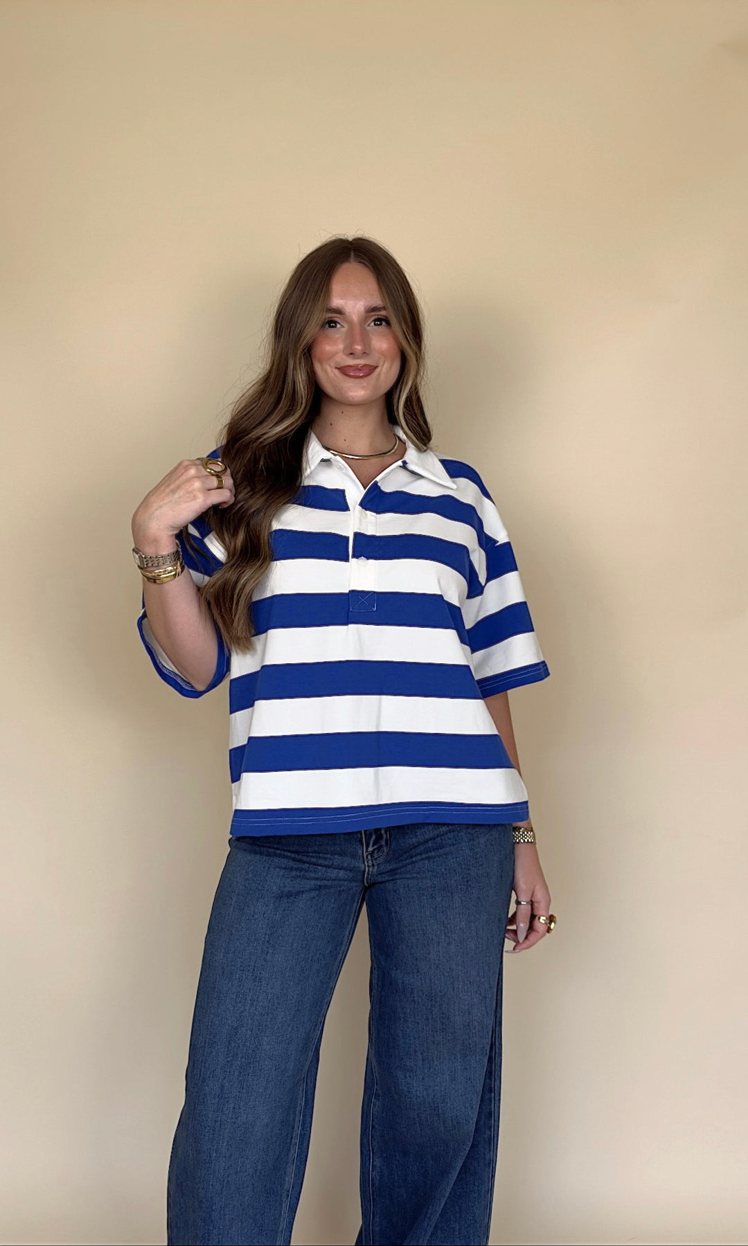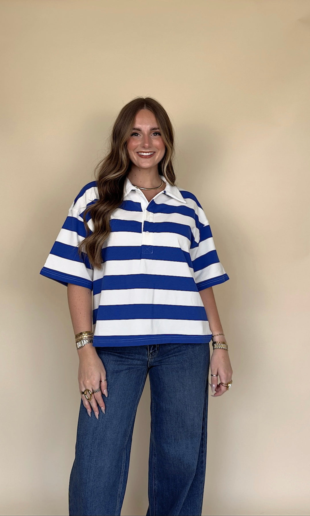 The perfect piece for gameday... this oversized collared shirt with blue and white stripes would be SO cute with baggy jeans!