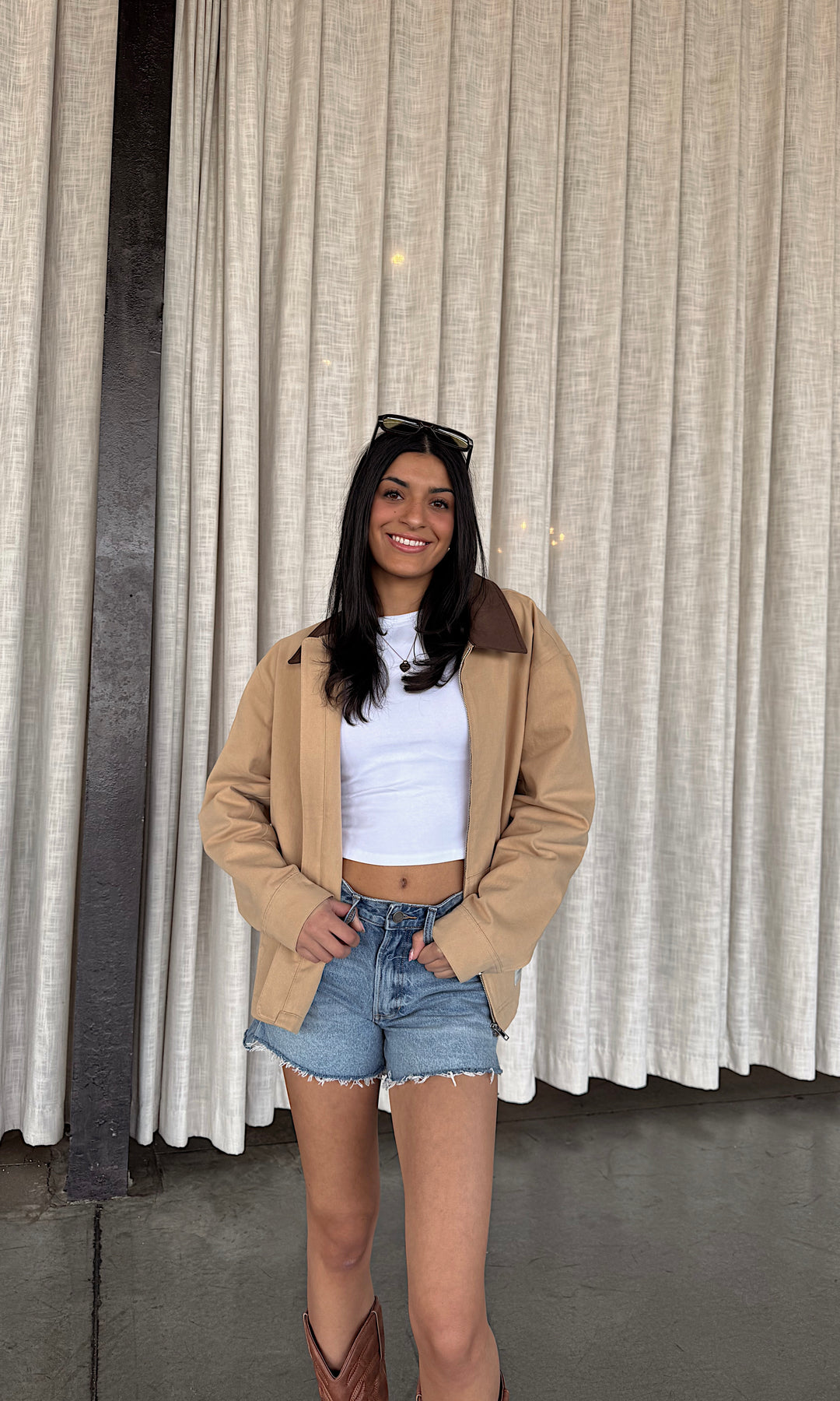 The perfect layering piece is finally here AND as a custom!! This tan workwear jacket with a brown collar is the perfect piece to go from winter to spring, plus the small Calypso patch adds the PERFECT detail!