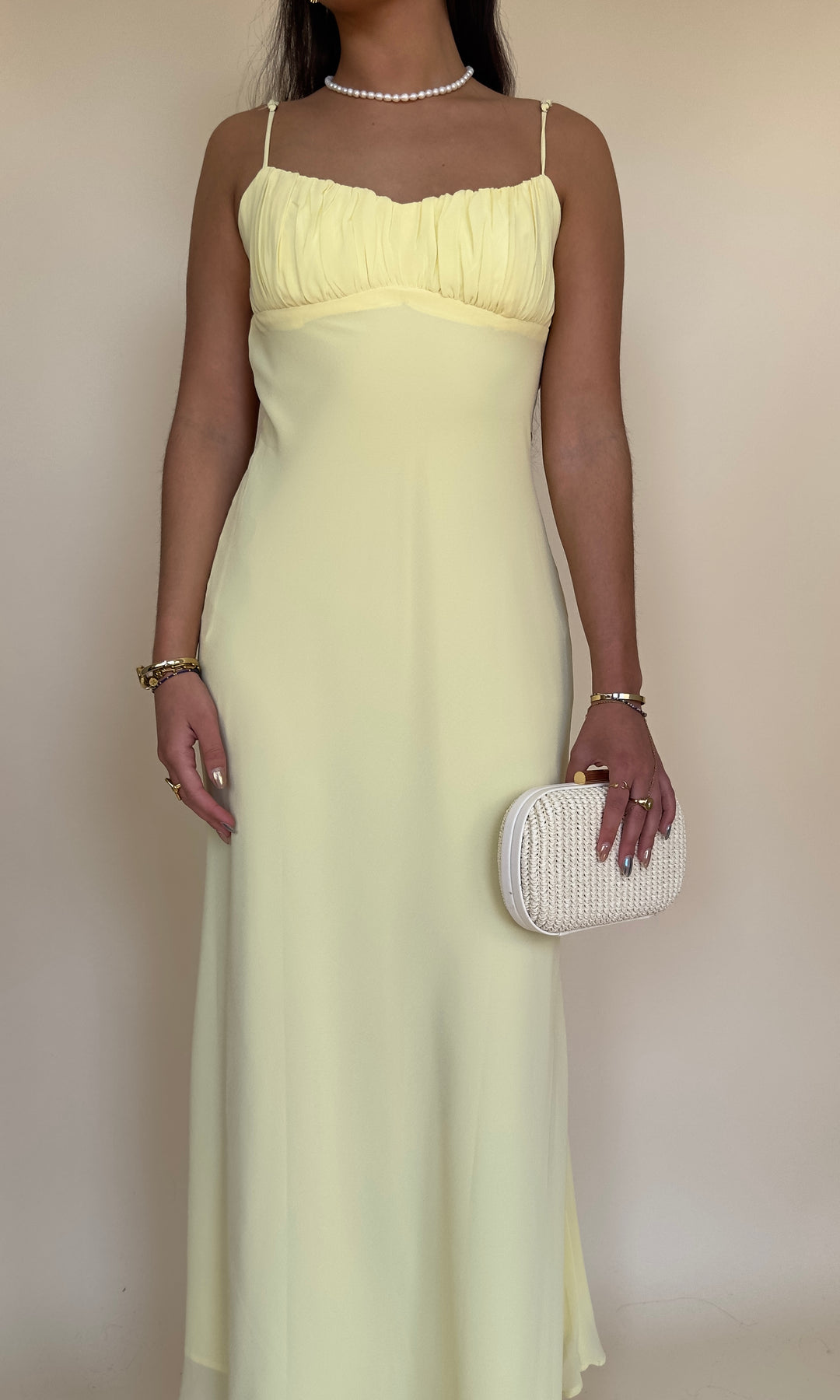 You aren't even ready for this dress. The Cyrus dress is the perfect early 2000's inspired butter yellow backless dress.
