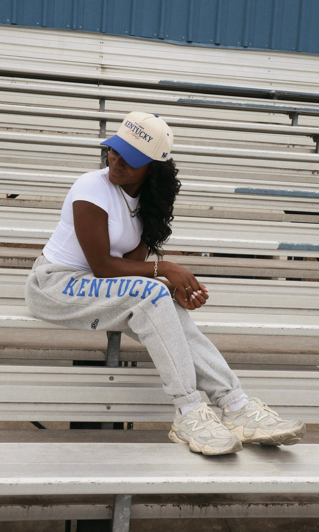 Heather grey jogger sweatpants with UK blue "Kentucky" graphic down the leg in block letters!