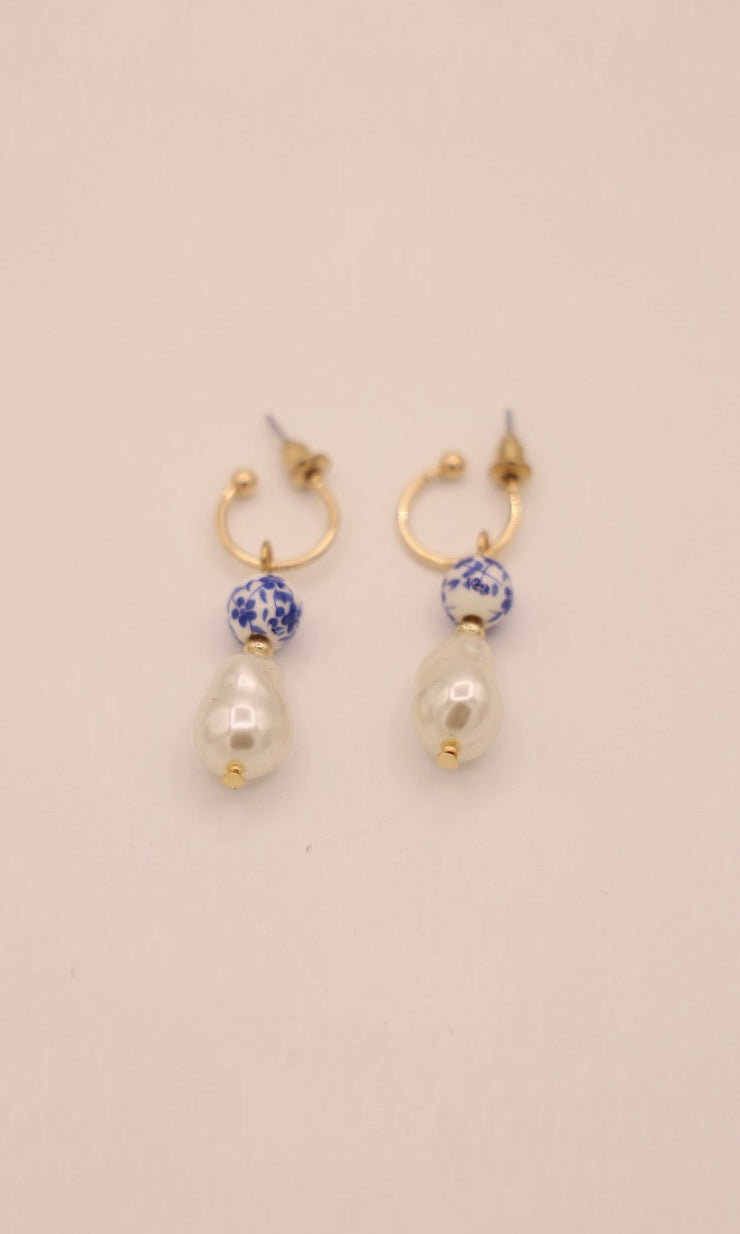 • Linked pearl drop drop earrings with blue accents.