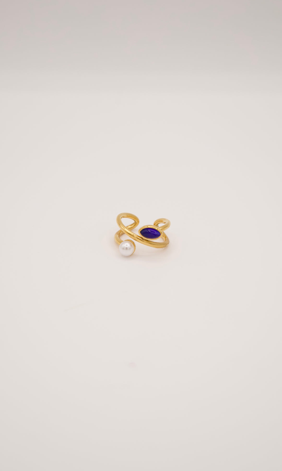 Gold wrap ring featuring a blue crystal and pearl stud.