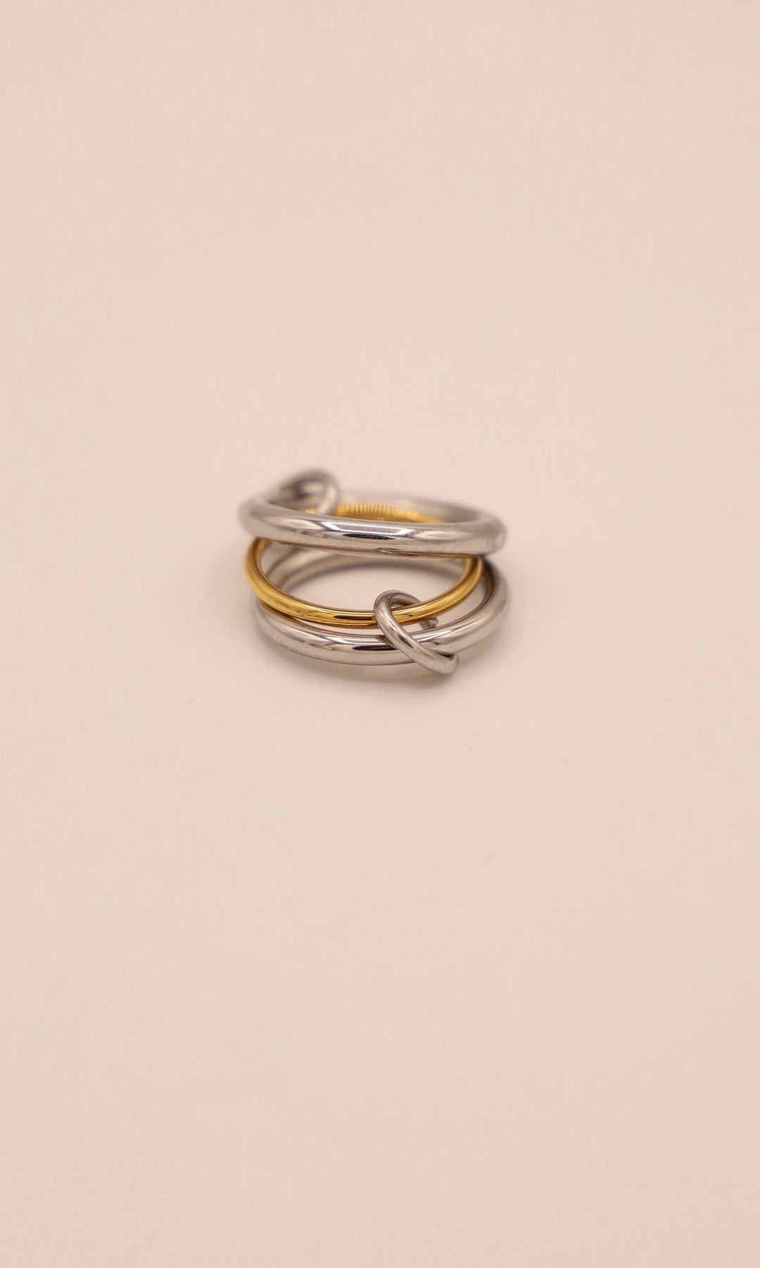Who needs a triple layer necklace when you can have a triple layer RING! This ring stack with two silver bands and a gold band in the middle is the perfect statement piece! Two small hoops to hold the bands together.