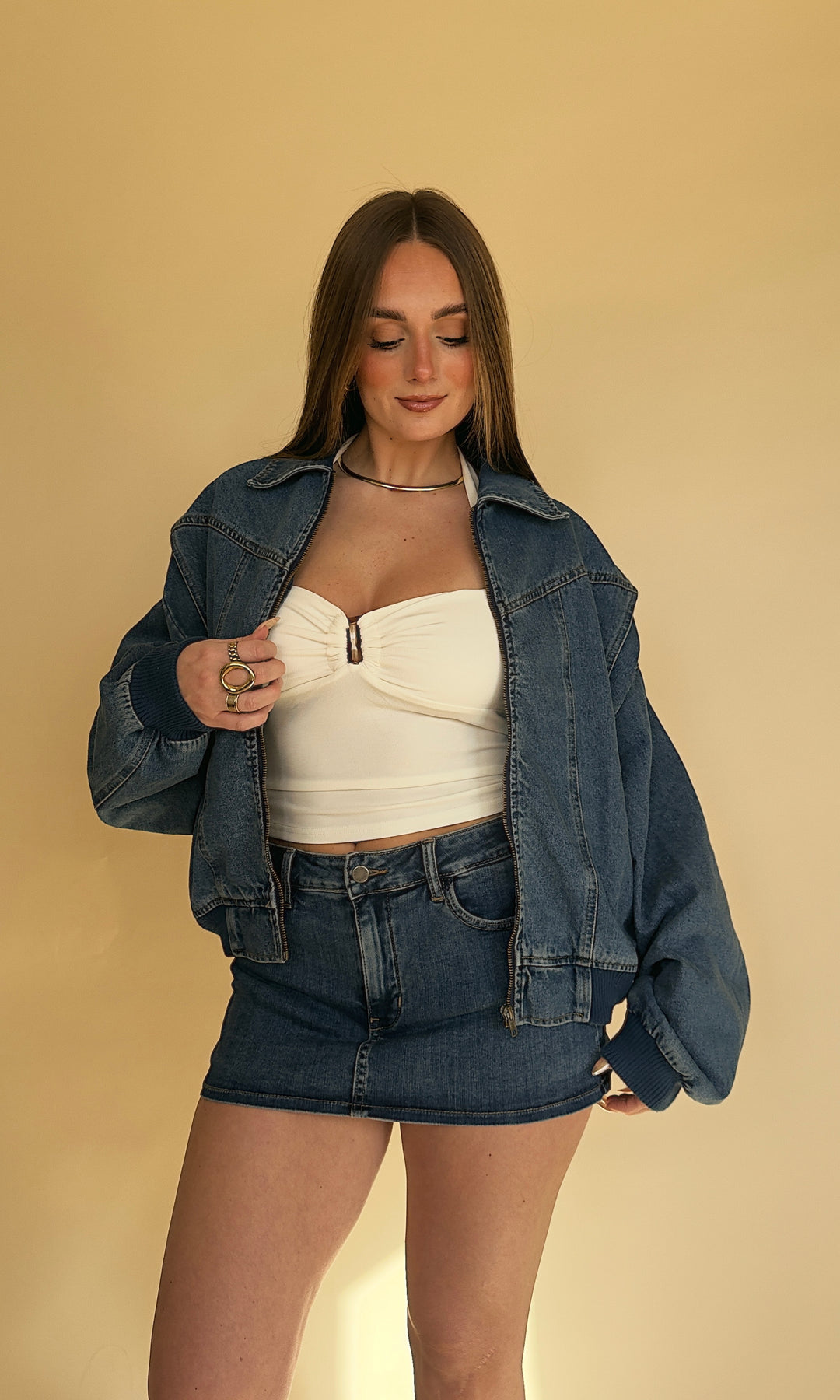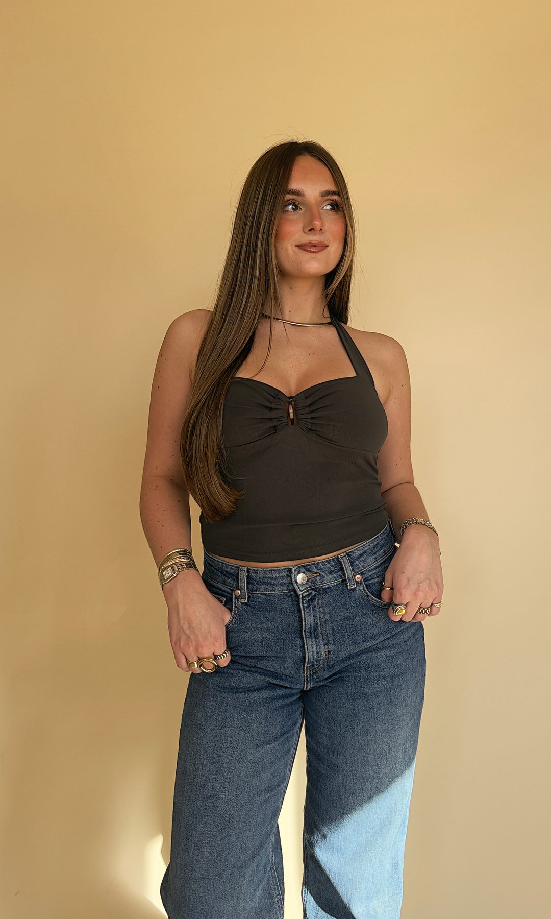 We’ve got your next GNO fit covered. This halter top, available in ivory or charcoal, delivers an effortlessly elevated look that pairs seamlessly with any outfit.