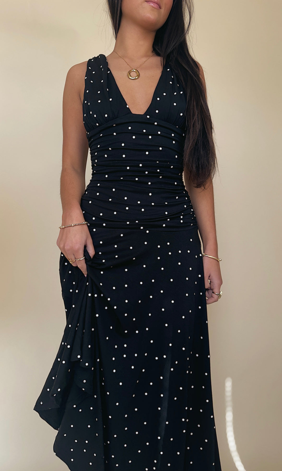Prepare to feel SNATCHED in this perfect polka dot midi dress!! You will want to wear this dress everywhere you go!!