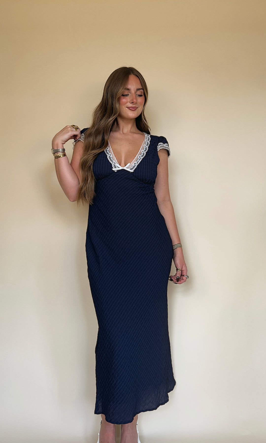 • The Nina Dress is lowkey iconic. This navy blue midi brings the vibe with delicate lace trim on the collar and sleeves is perfect for chill brunches, museum dates, or just romanticizing your errands.
