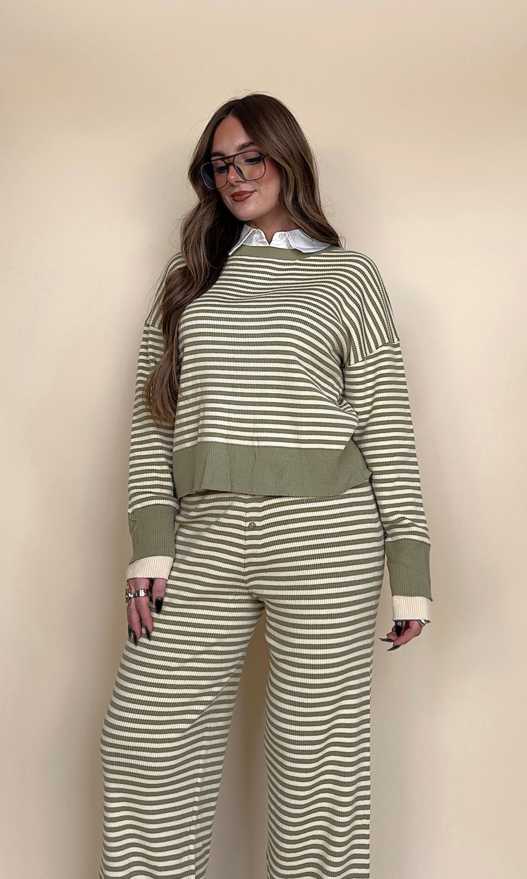 The All Day Pant is perfect for a chilly day on campus or that spring break flight! Featuring light green stripes and a perfect sweater texture.