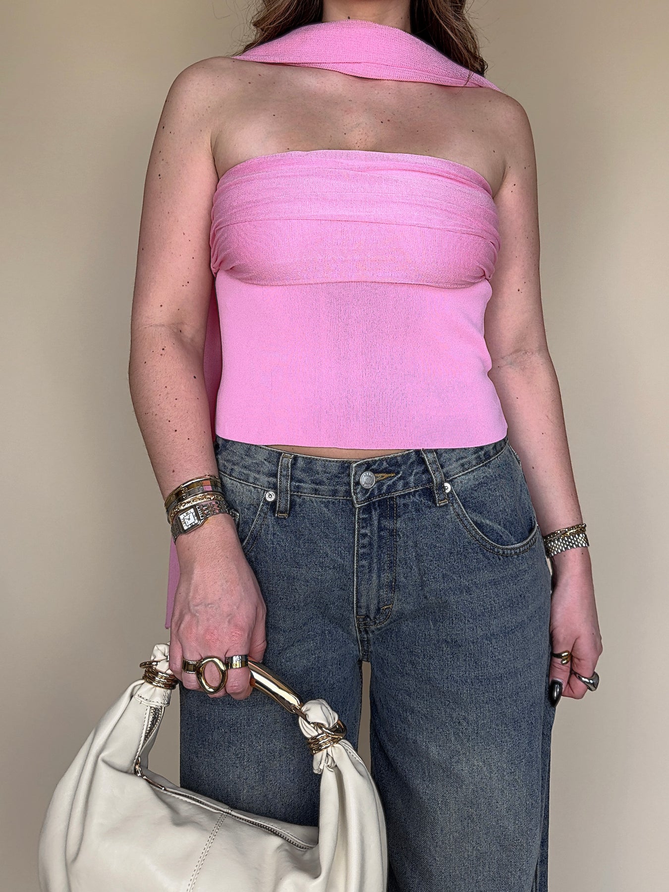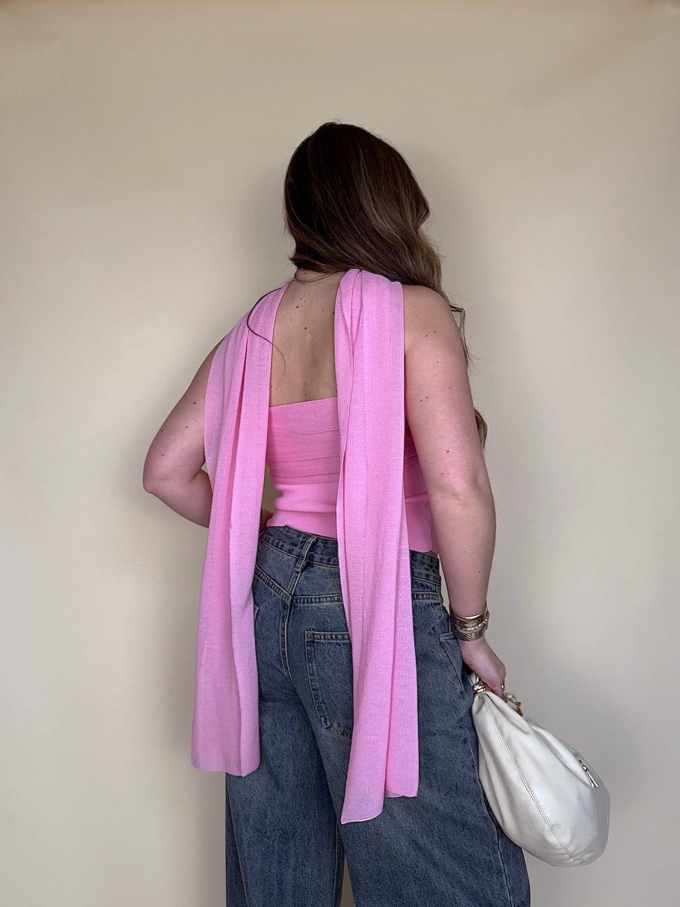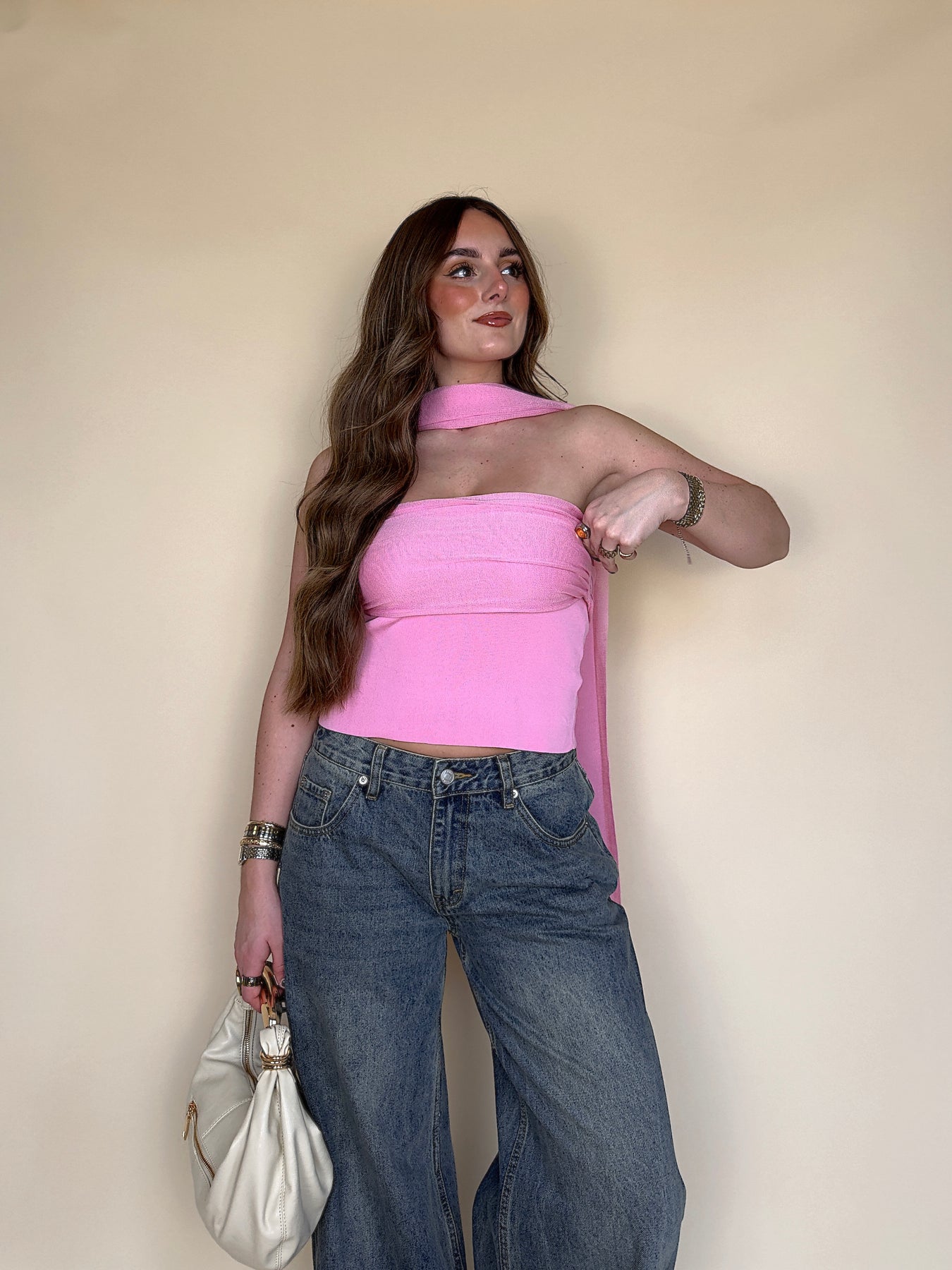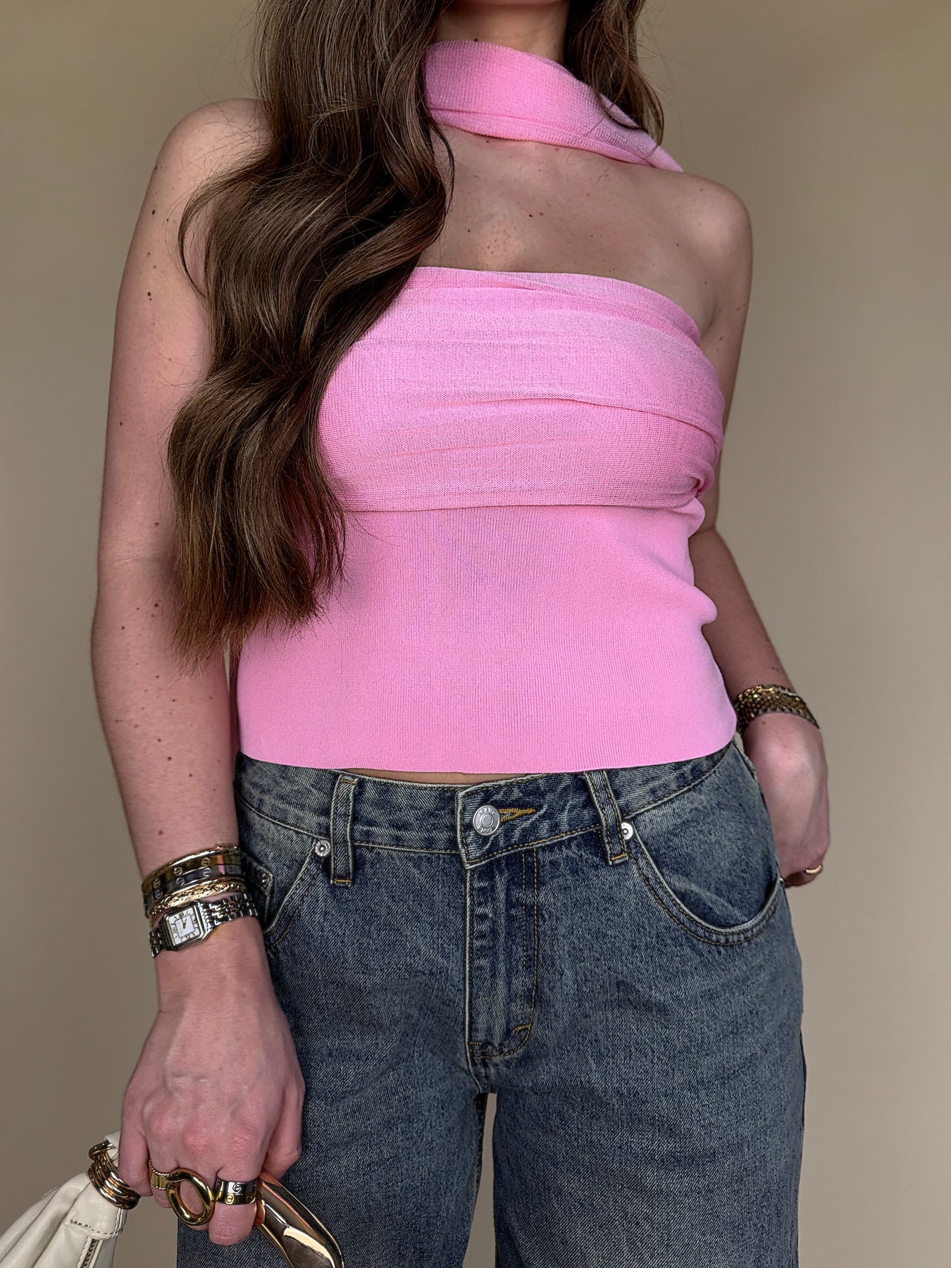 • Say HELLO to your new favorite piece for spring and summer! This hot pink strapless top with the cutest scarf is sure to keep you fitted ALL season.