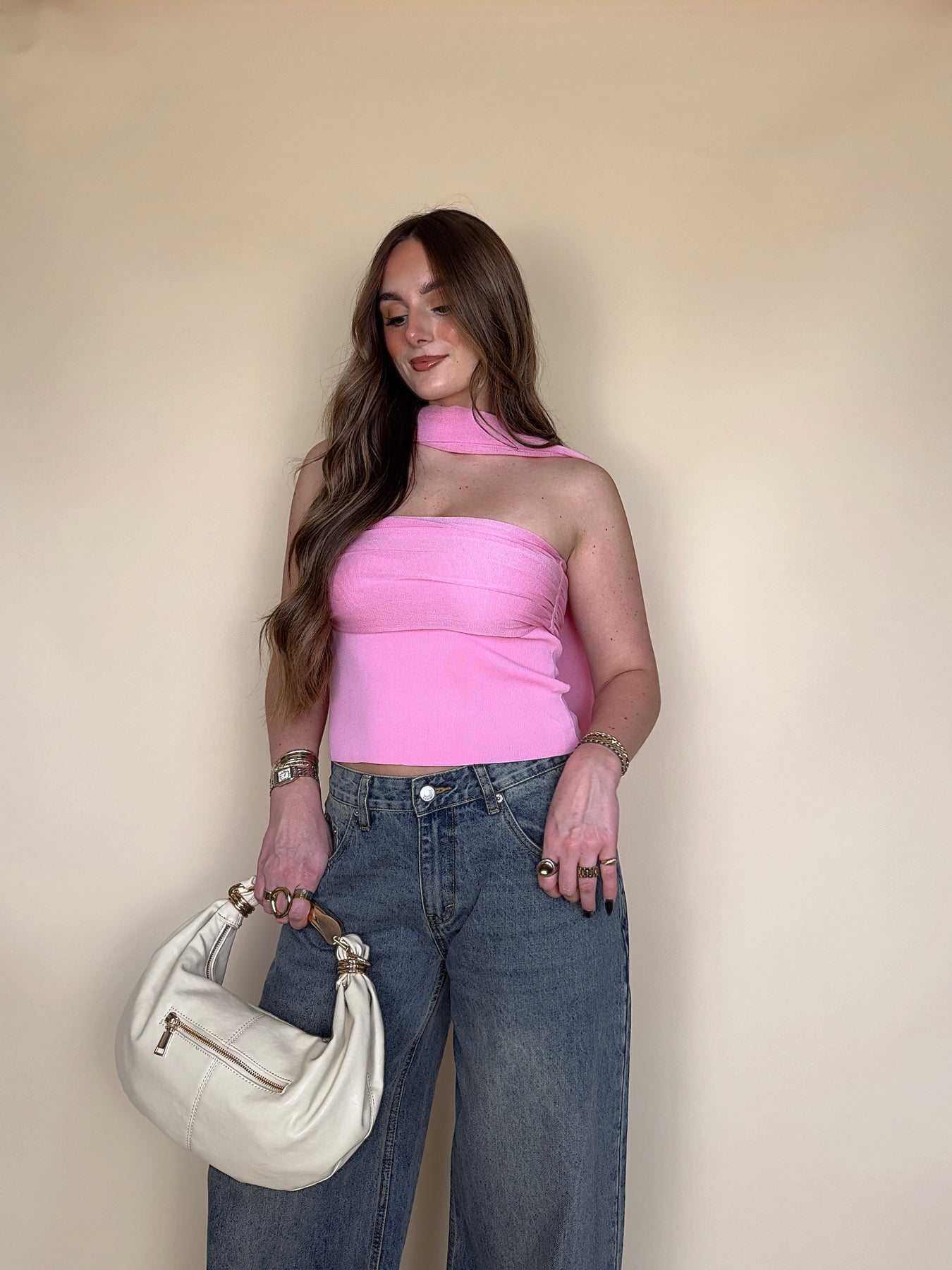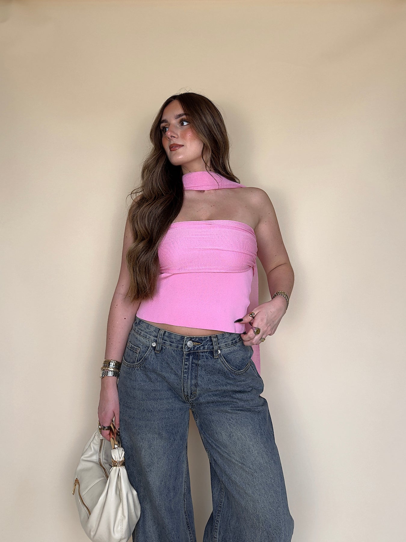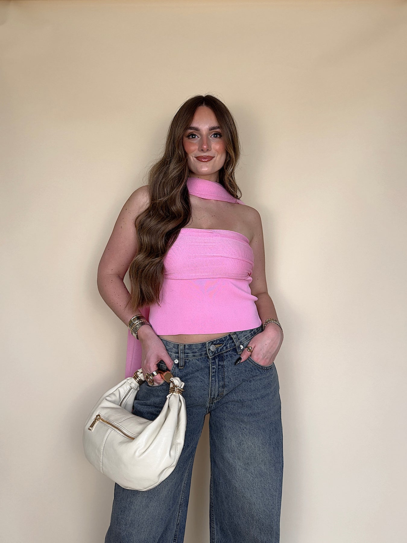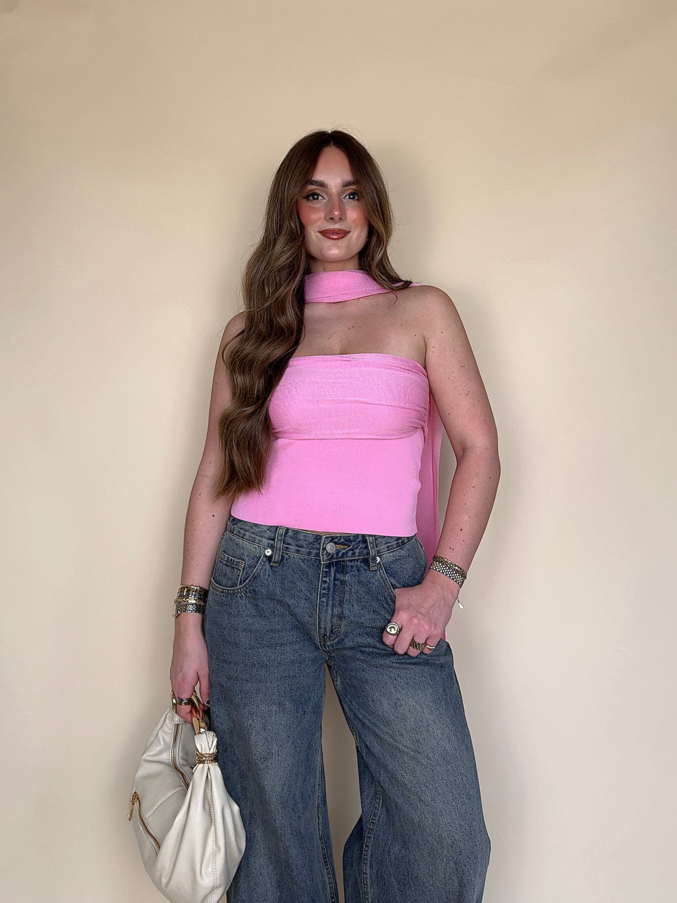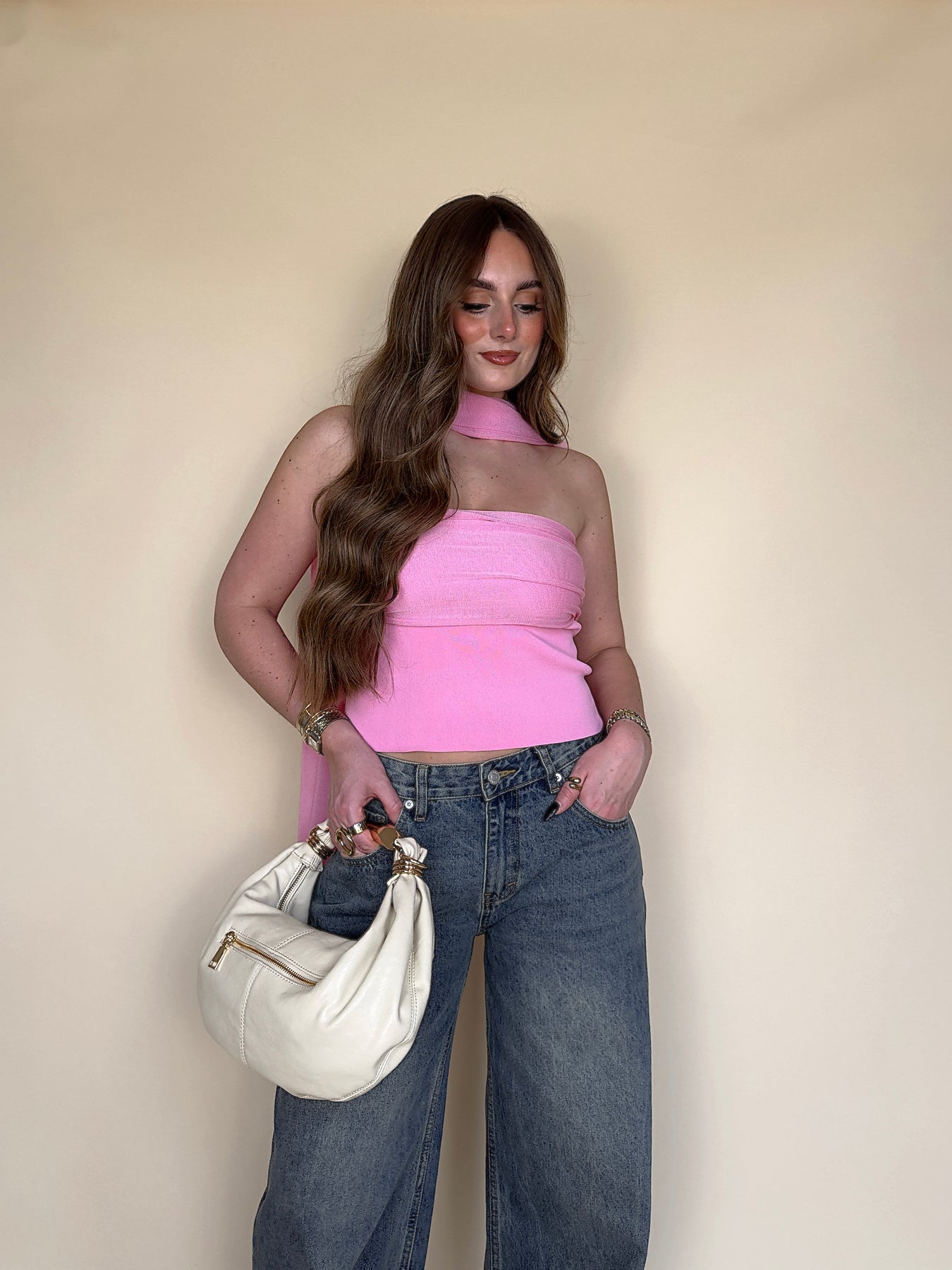 • Say HELLO to your new favorite piece for spring and summer! This hot pink strapless top with the cutest scarf is sure to keep you fitted ALL season.