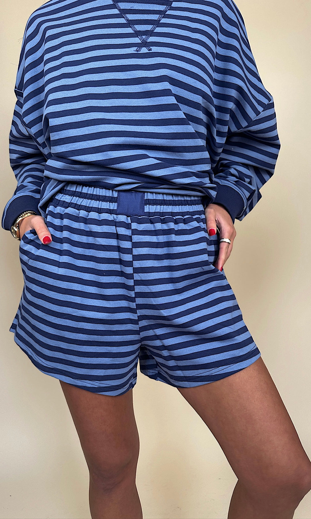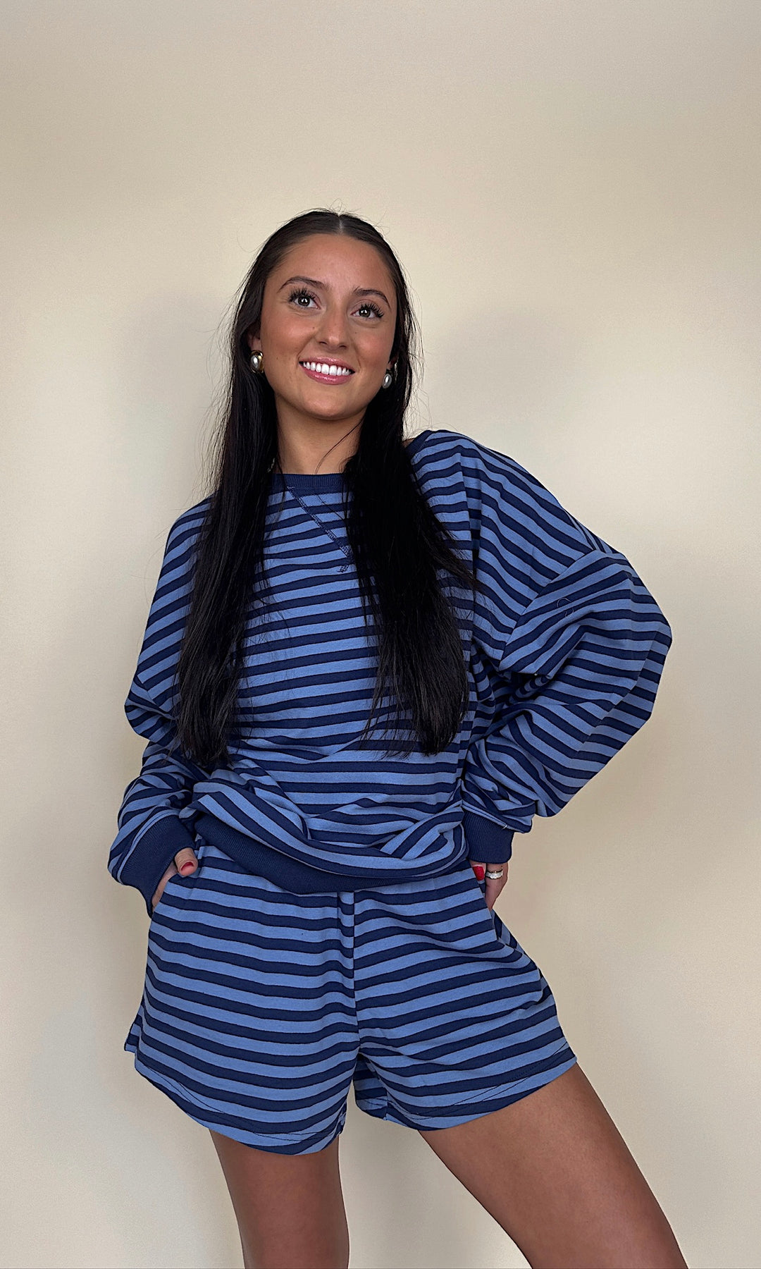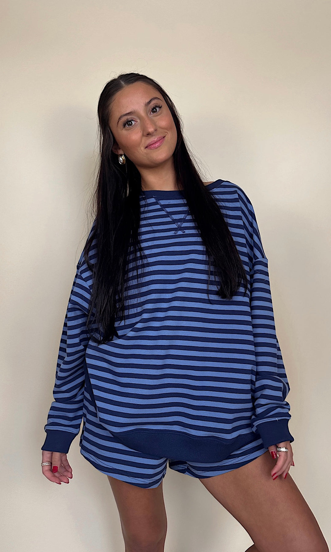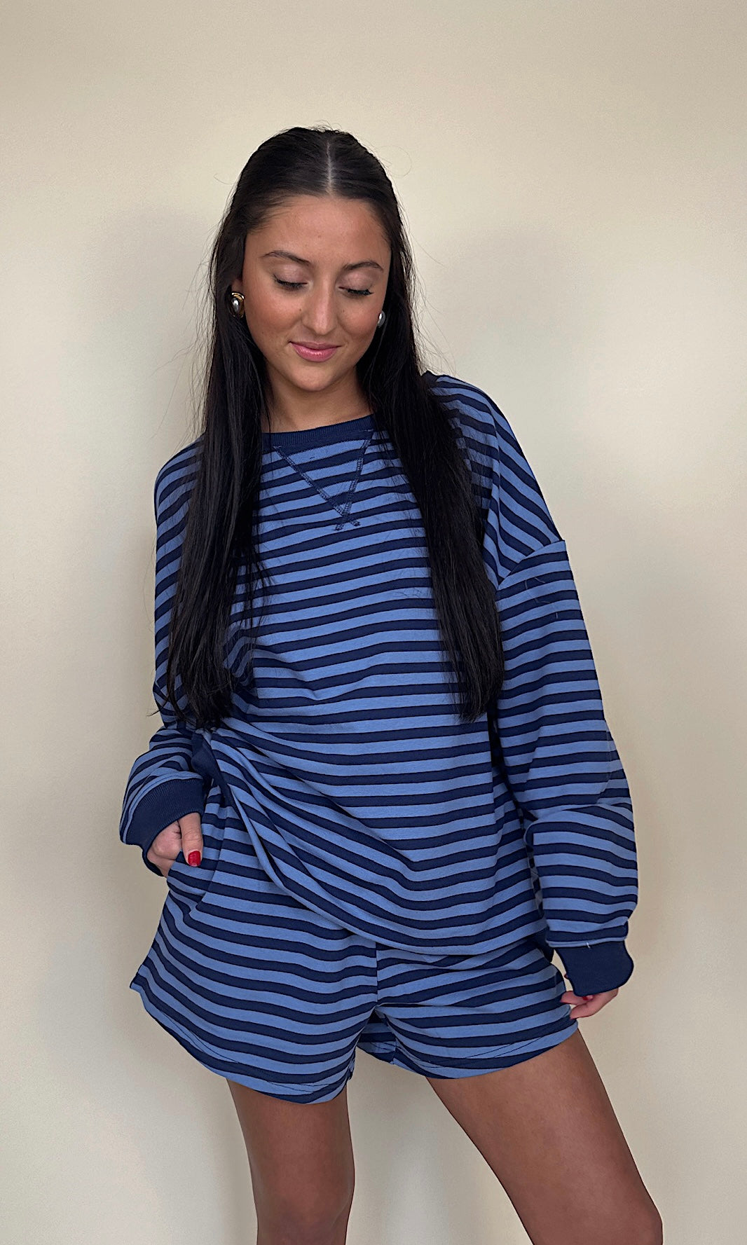 This lounge crewneck features classic blue and navy stripes for that effortless, elevated off-duty vibe. The contrast stripe combo feels timeless and sporty, but still soft and feminine — the kind of piece you keep reaching for whether you're running errands, grabbing coffee, or curled up on the couch.