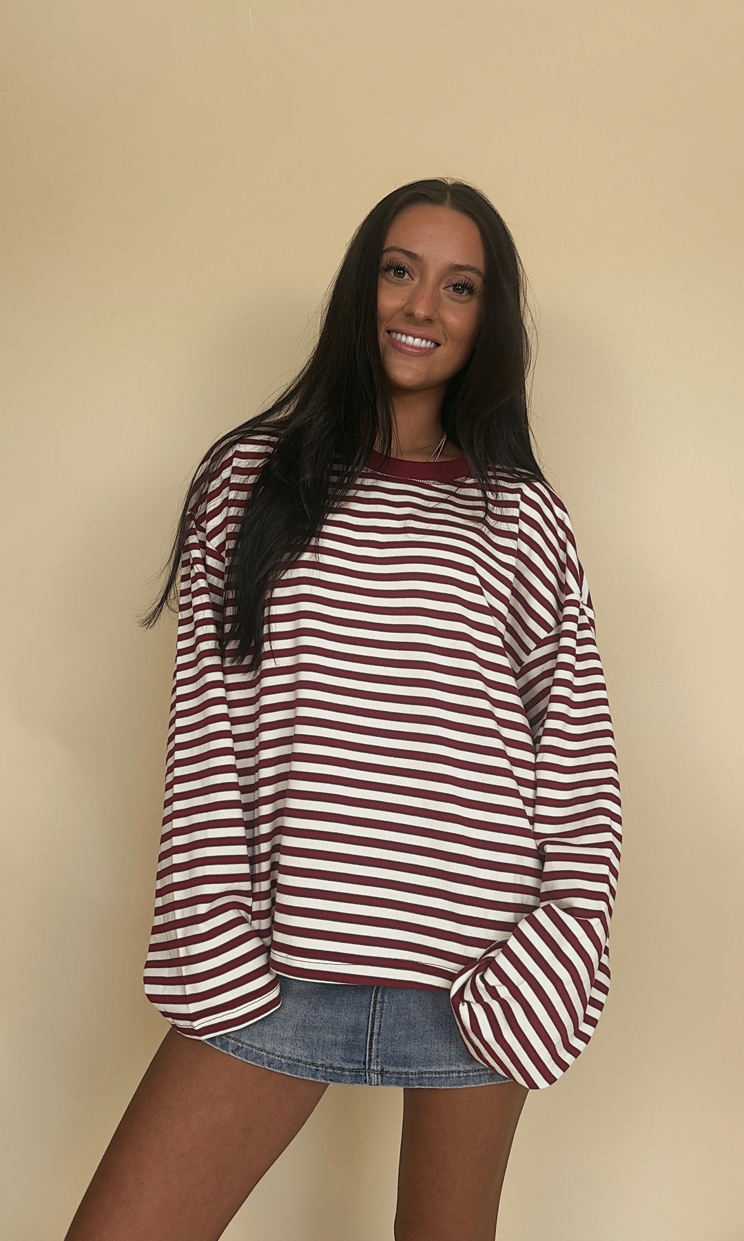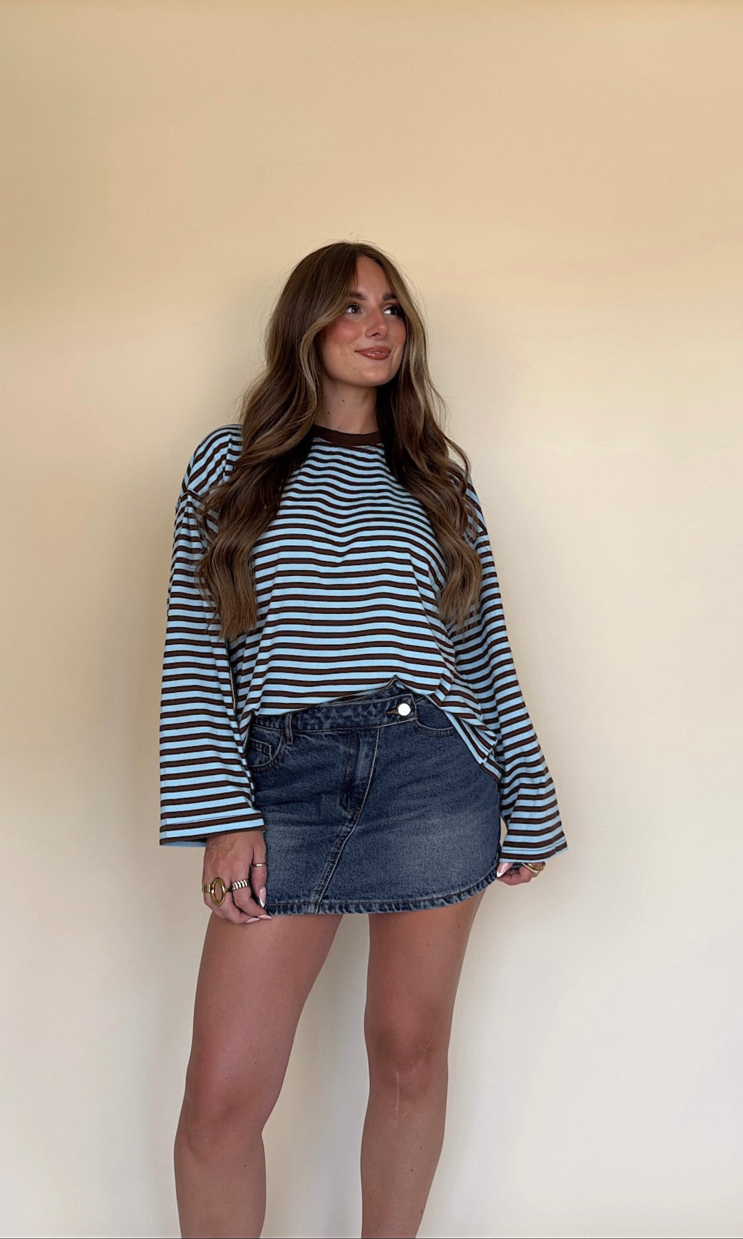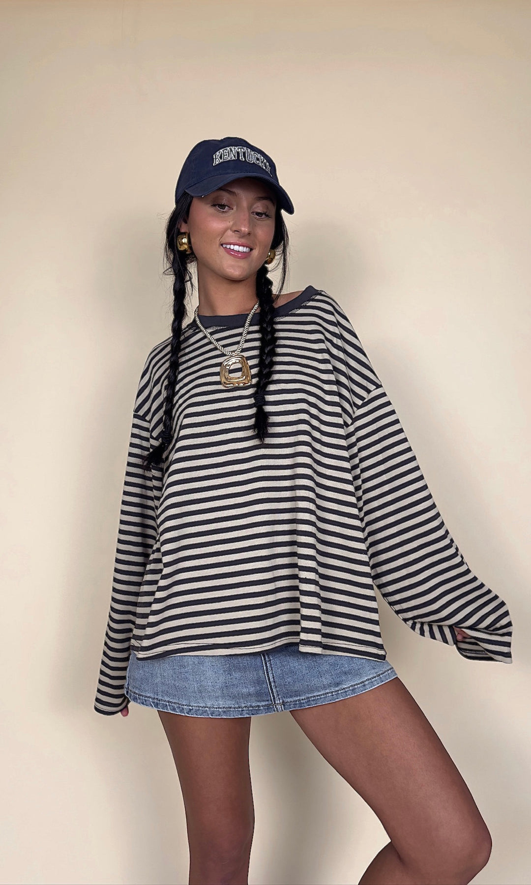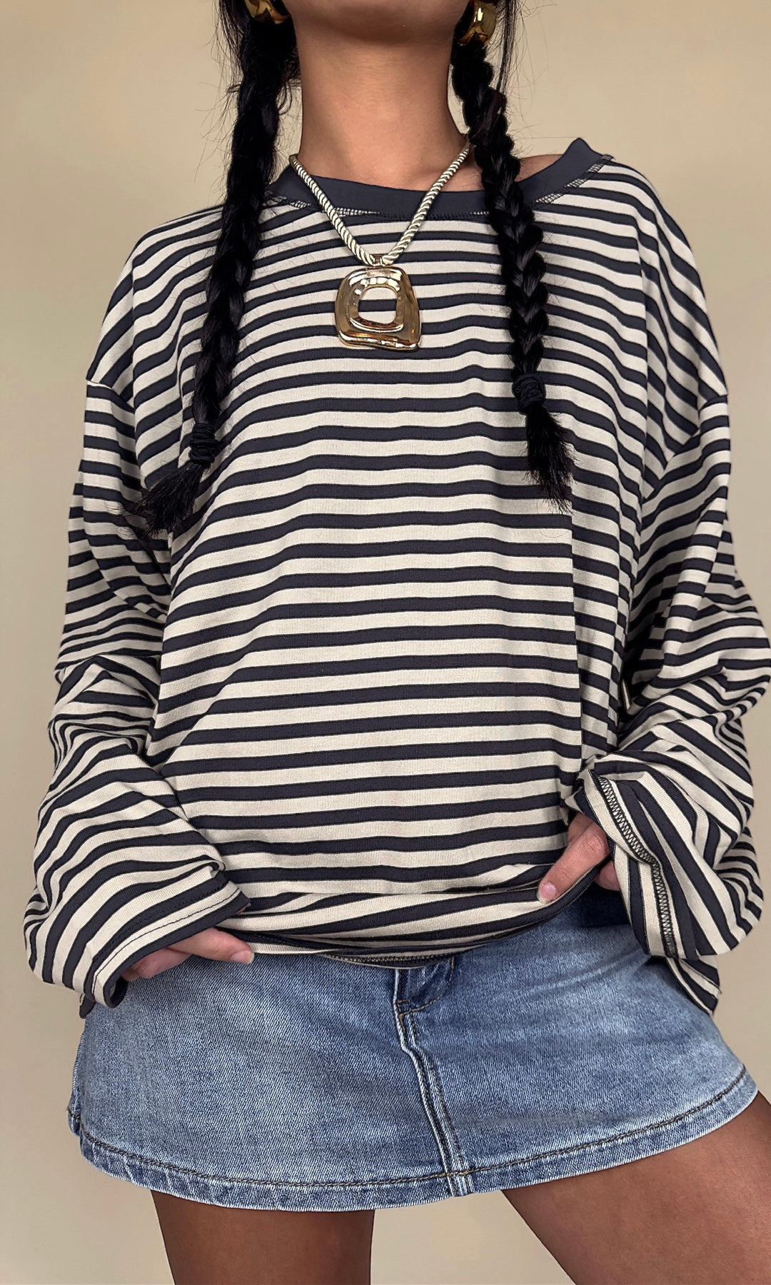 It's giving early 2000s!! This oversized striped long-sleeve is the perfect effortless look! Choose light blue/navy or taupe/charcoal.