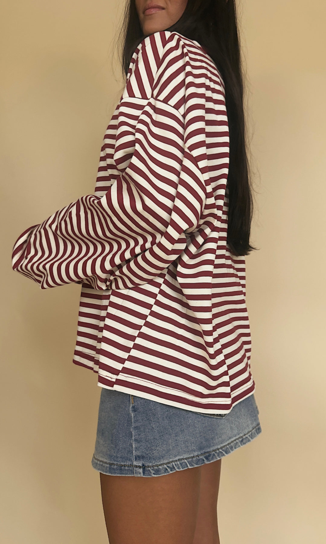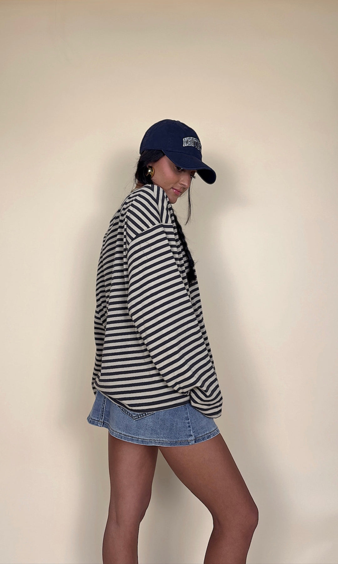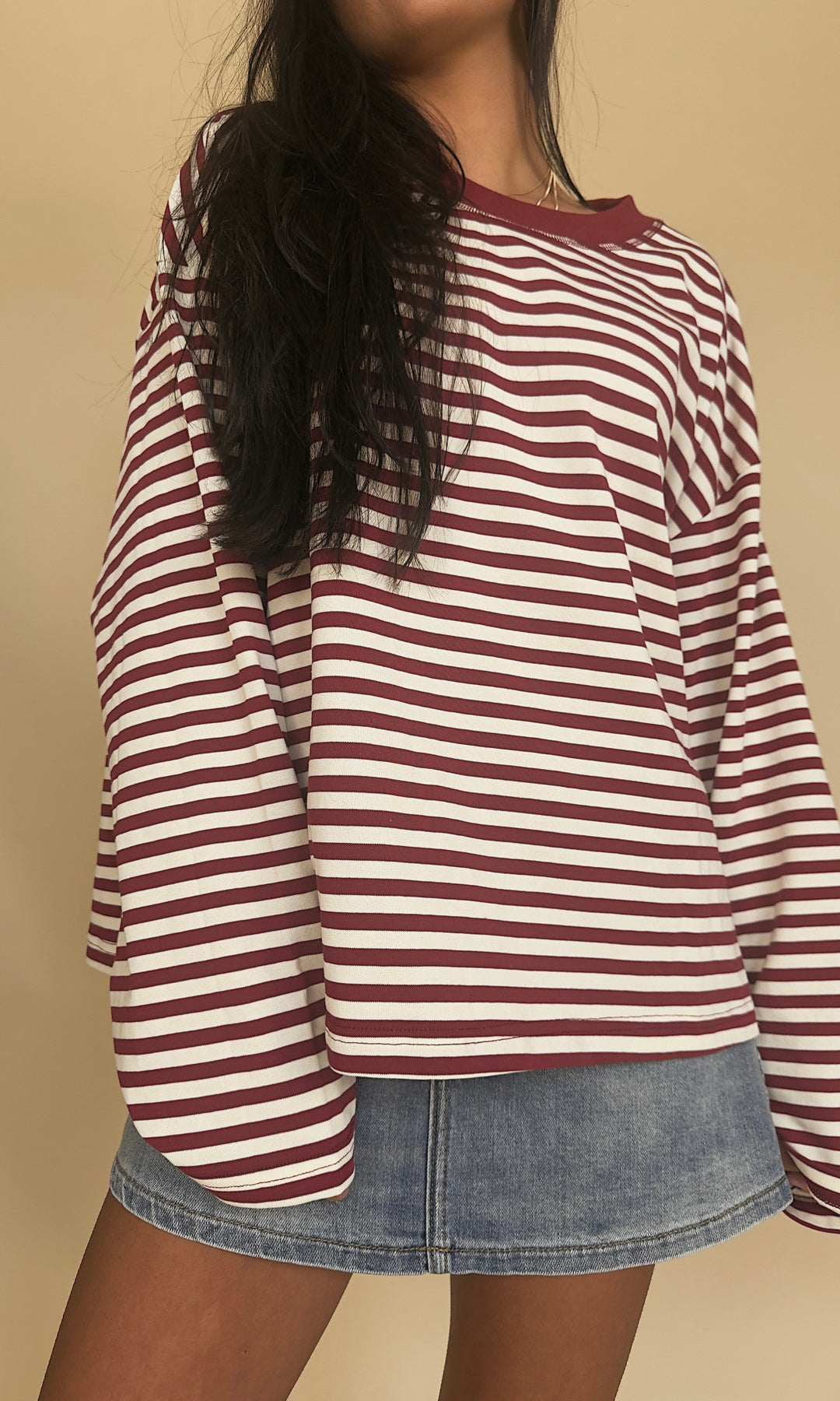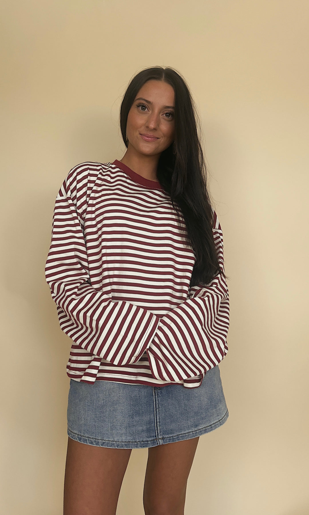 It's giving early 2000s!! This oversized striped long-sleeve is the perfect effortless look! Choose light blue/navy or taupe/charcoal.