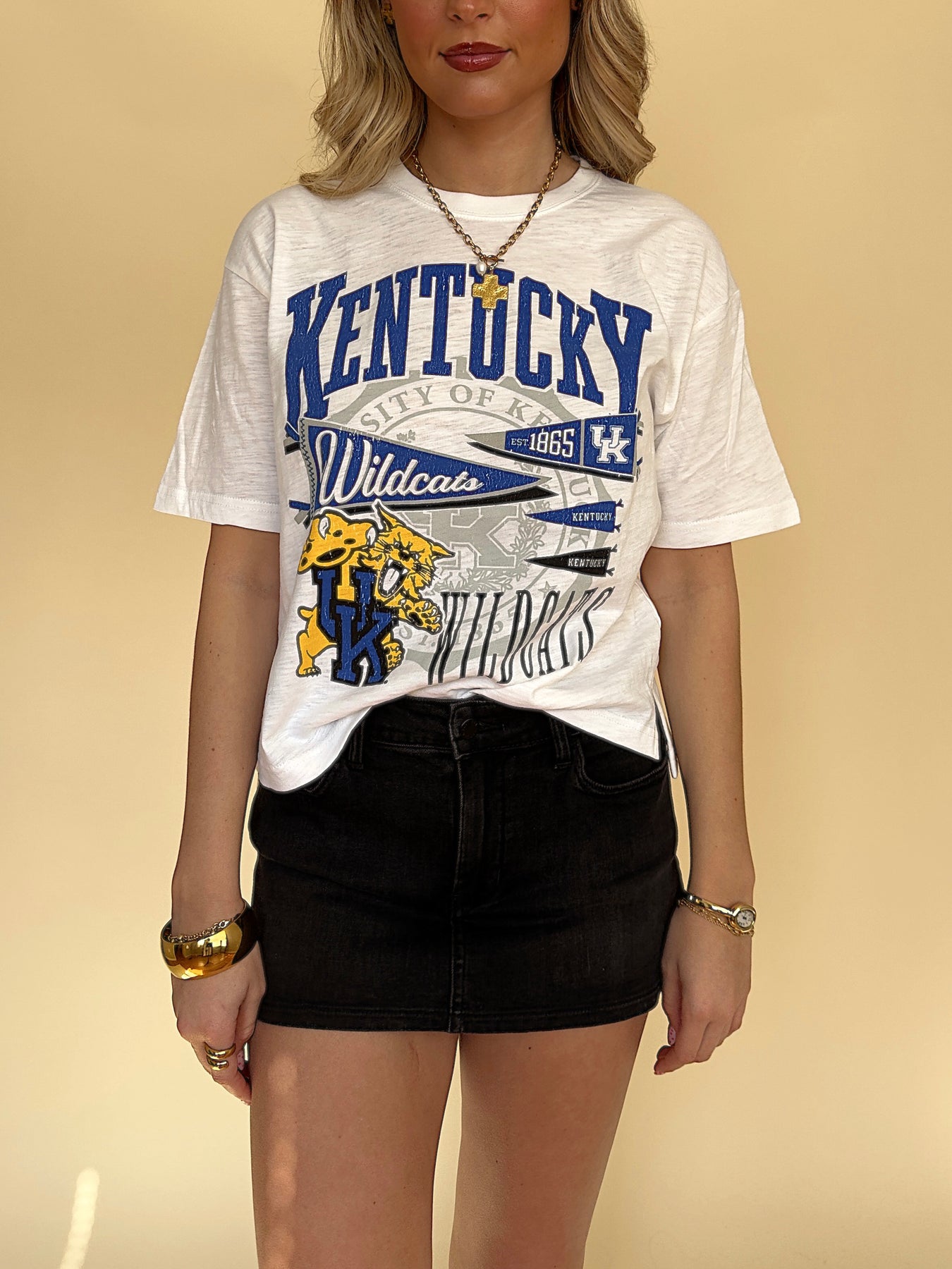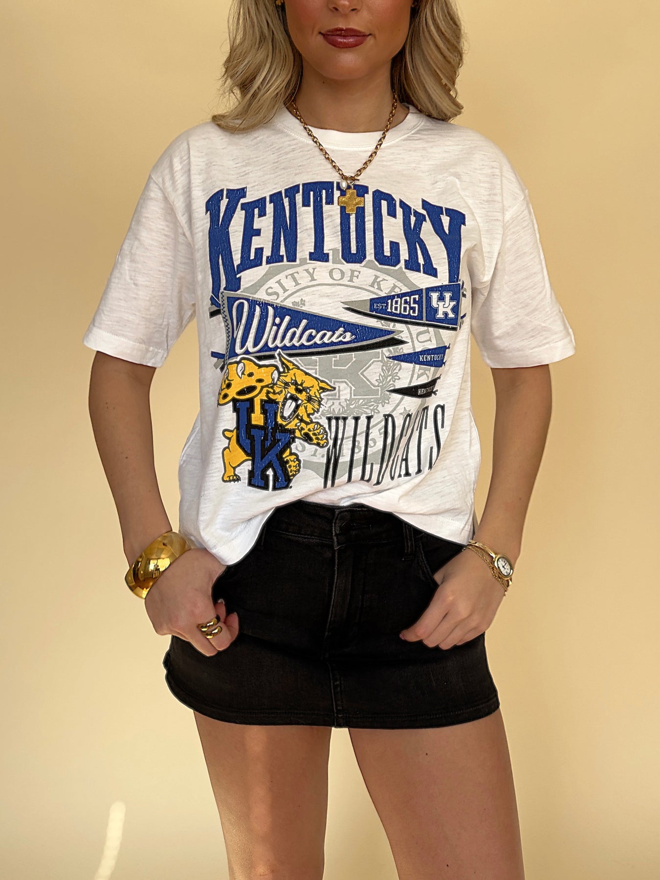 The cutest retro inspired Kentucky gameday tee is HERE! Our Knockout Top's intricate Kentucky licensed logo and light weight boxy blank makes for the perfect staple for football and basketball season!