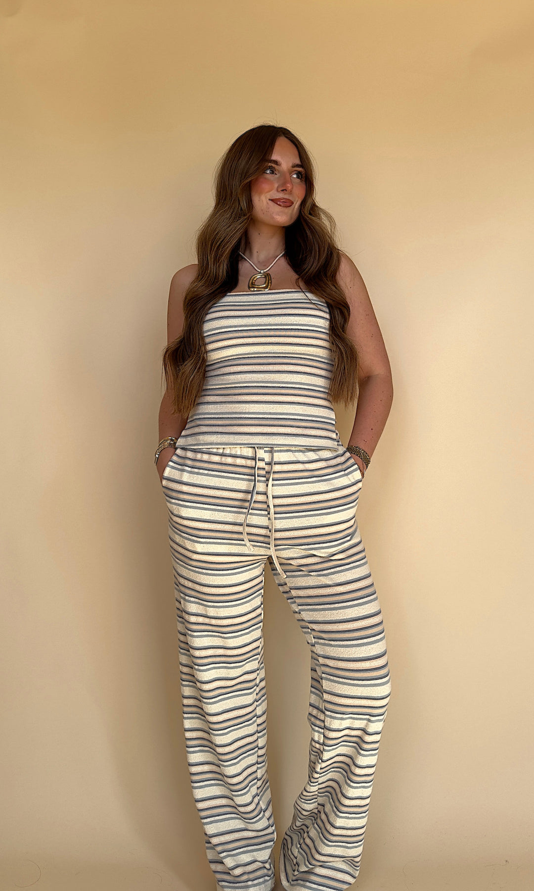 Tube Tops are BACK for the summer! Wear this one striped top with your favorite pair of denim shorts..Or even better the matching Showing Love Pant.
