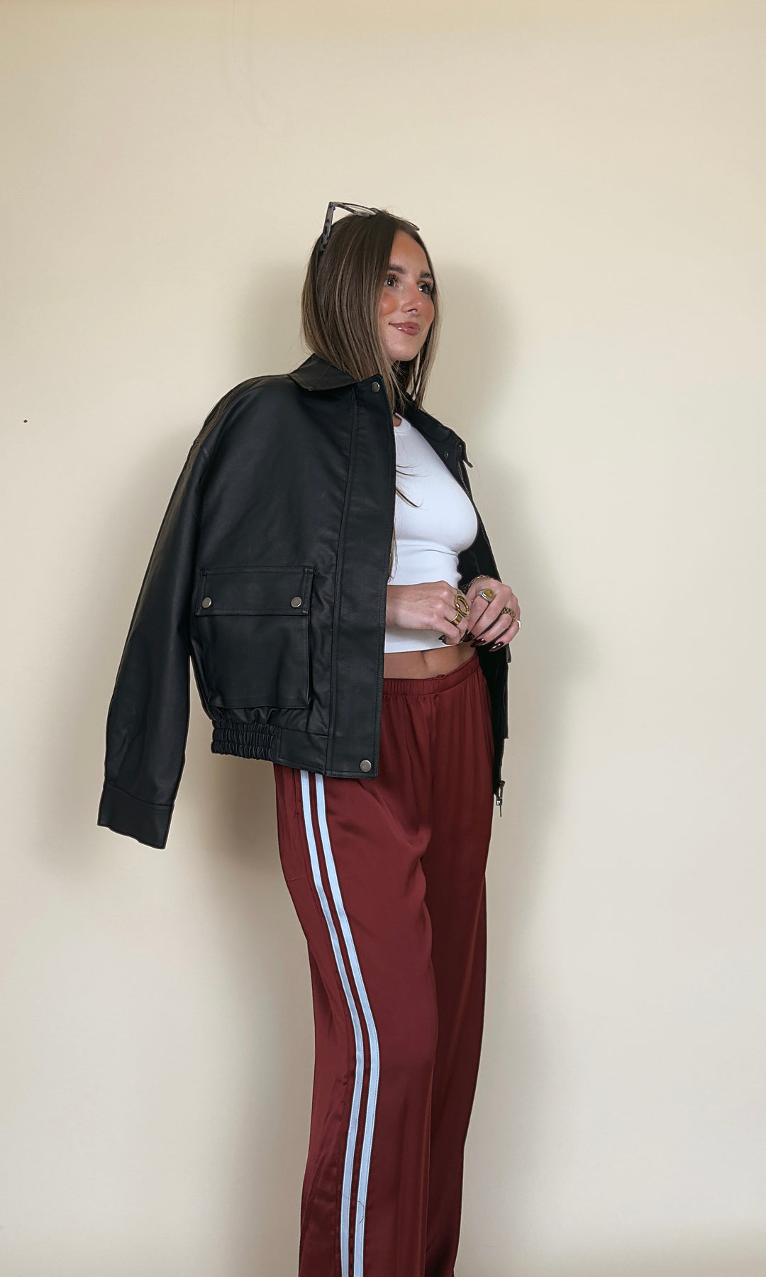There is nothing more cool girl than a good pair of track pants! Add a pop of color to your closet with these perfectly loose, red track pants with powder blue stripes.