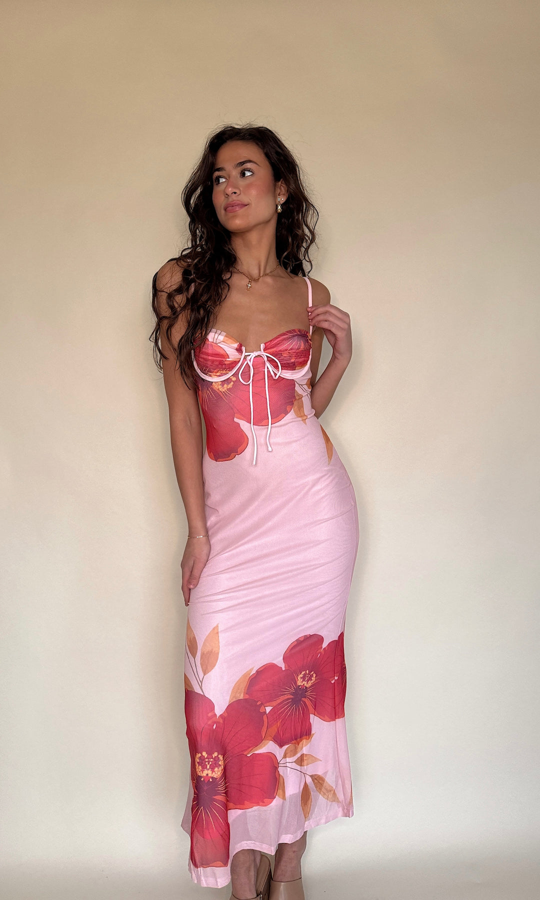 This pink floral dress is pure romance! With its soft hues, graceful flow, and beautiful neck line, it's perfect for a sunny day or a sweet soirée!