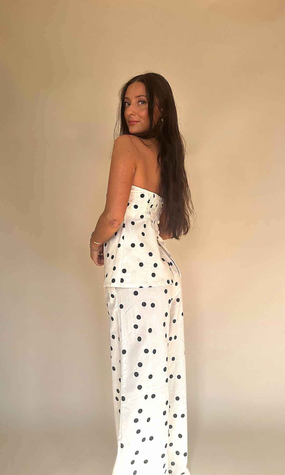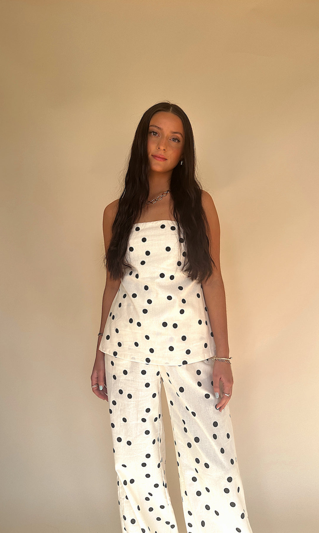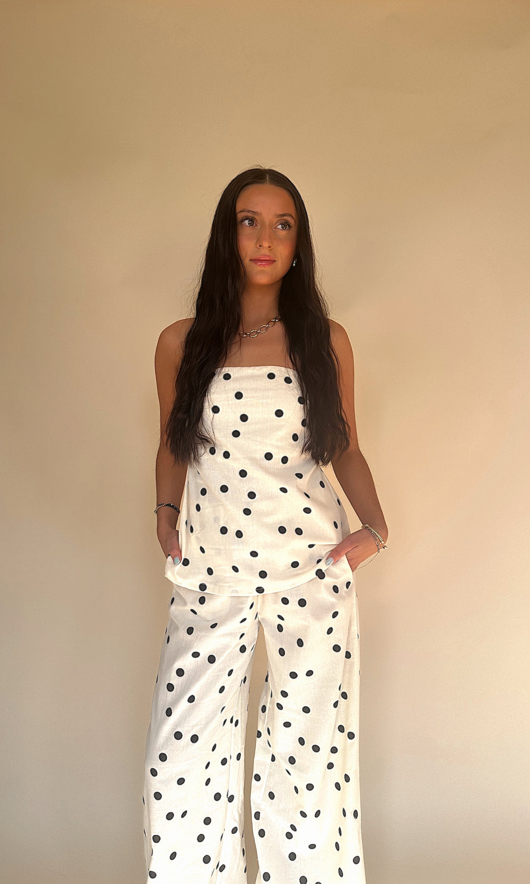 Our Crossed A Line Pants are designed in a breathable linen fabric with a classic polka dot print that never goes out of style. The mid rise, tailored fit creates a sleek silhouette while keeping things light and effortless..