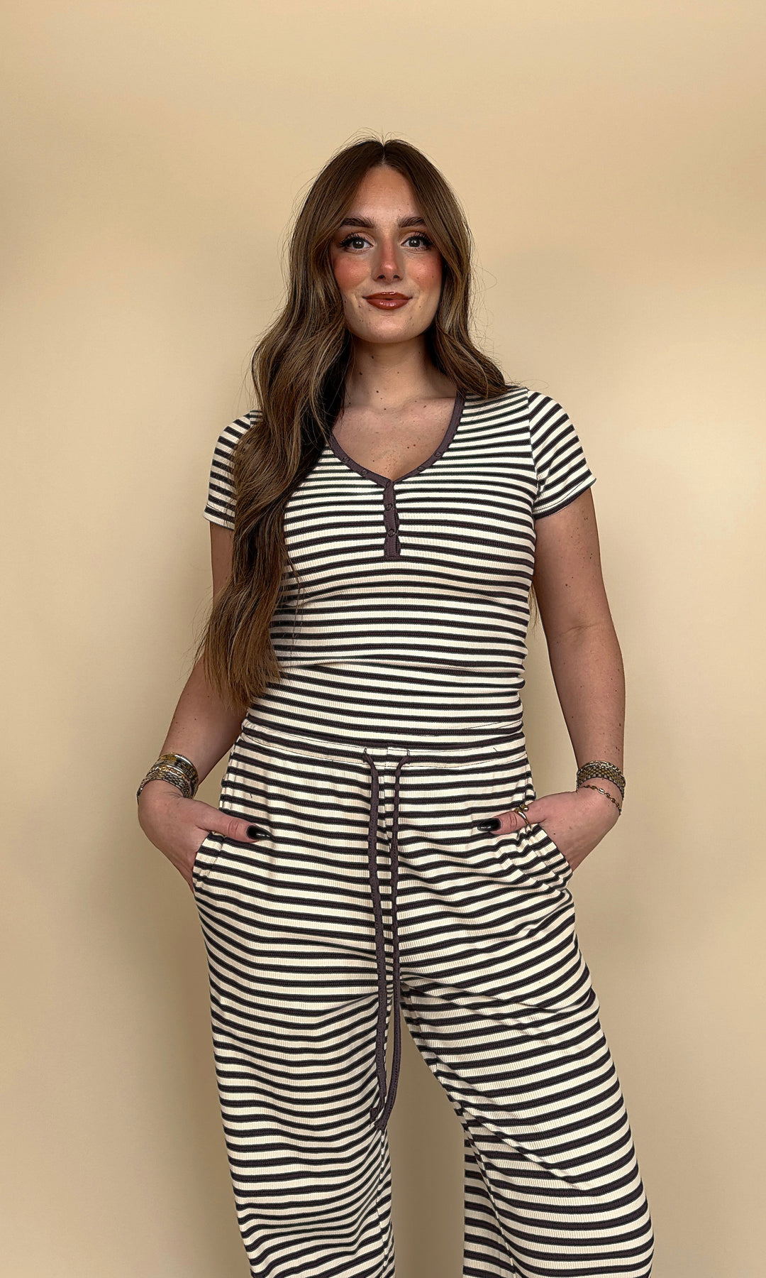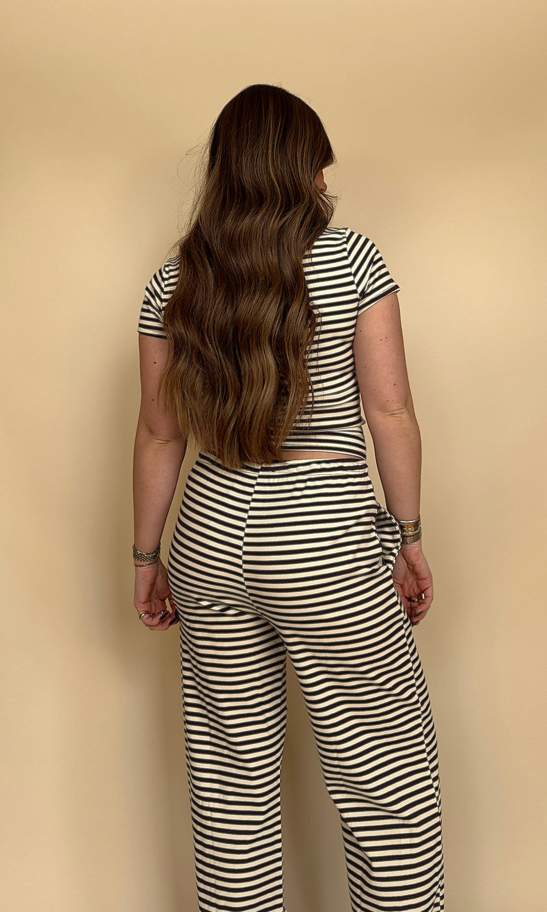 Wanna give IT girl on campus? This set is the way to do it! These striped loungewear pants with a relaxed fit pair perfect with the matching top or with a neutral oversized crew!