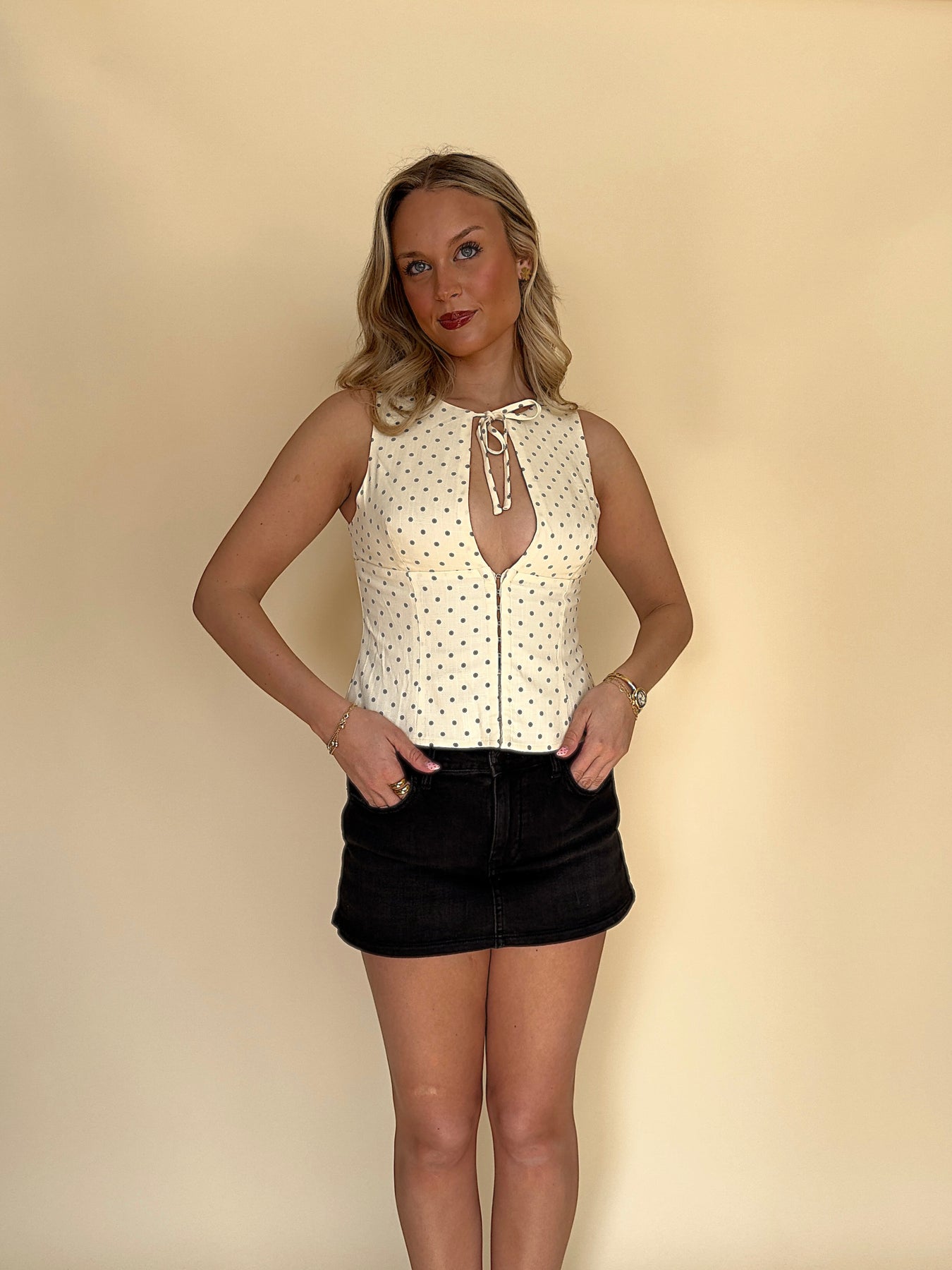 A new GNO top has entered the chat! This adorable micro black polka dot tie front tank has the most flattering front clasp body! Pair our Voltage Top with a low rise mini skort or a pair of jeans and pointed toe heels!