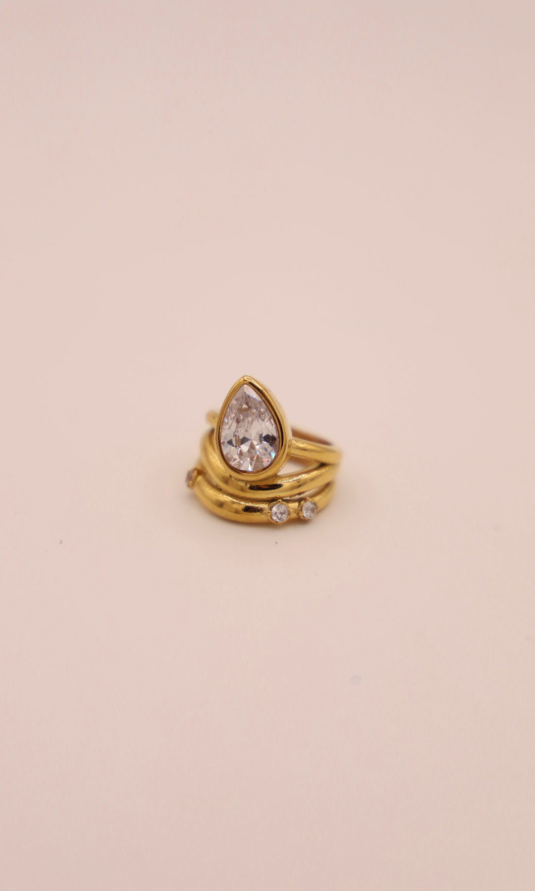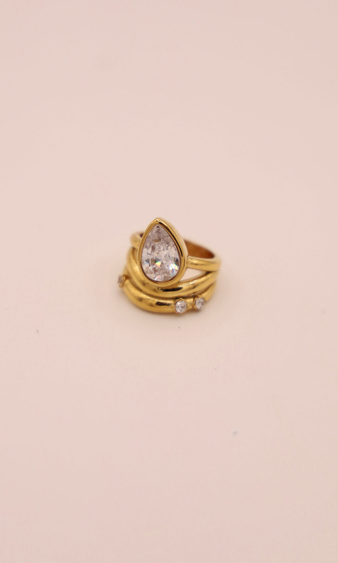 You're going to WISH your engagement ring looked like this, but we're just marrying ourselves this year with this BEAUTIFUL abstract gold ring with a large teardrop shaped crystal and small studs throughout the band.