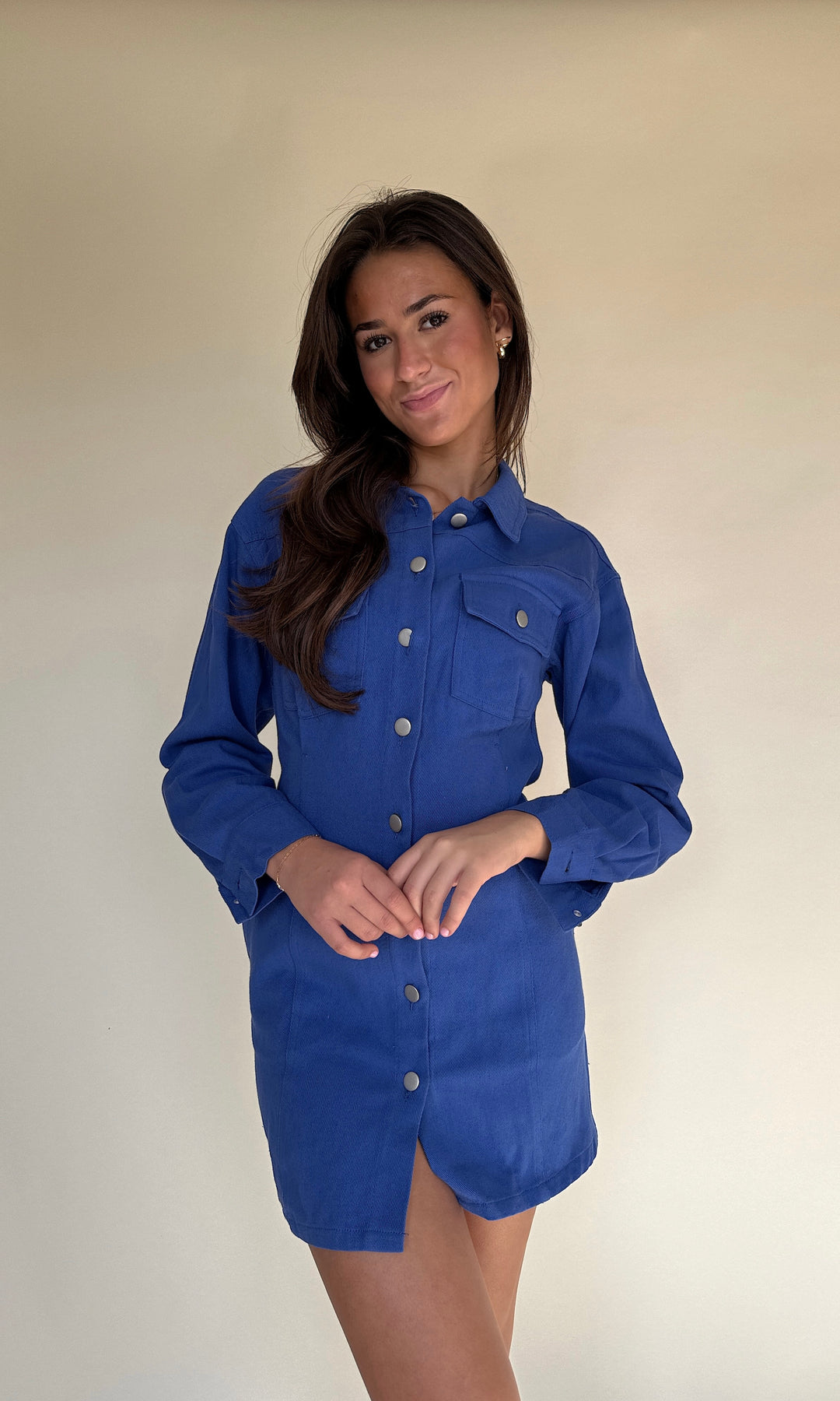 We LOVE gameday at Calypso and this denim long sleeve dress is calling your name. Silver buttons down the front with a collared neckline.