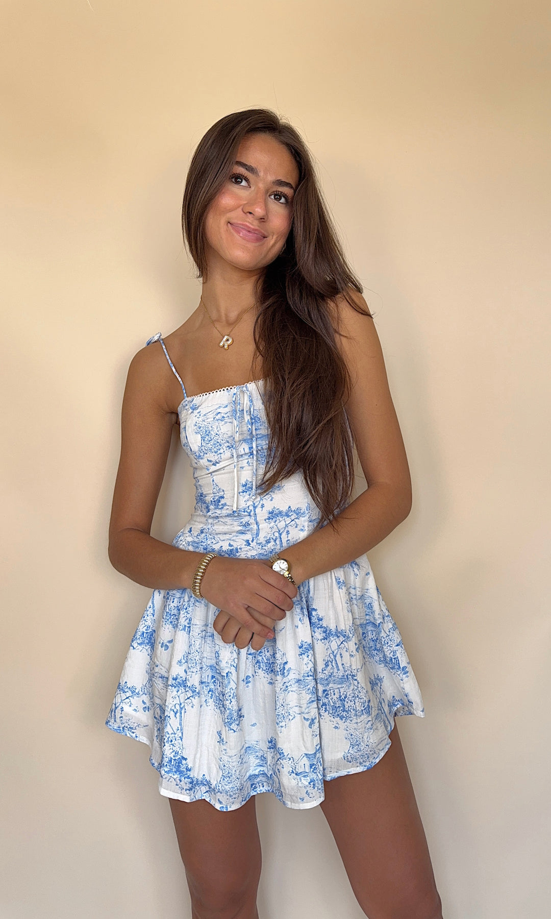 Beautiful white dress with baby blue prints throughout. She has bows to secure for the sleeves and has a buttery soft material.