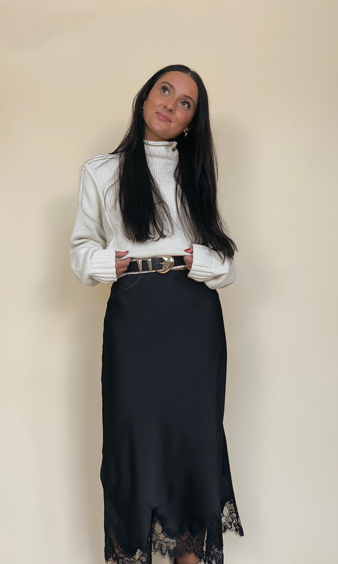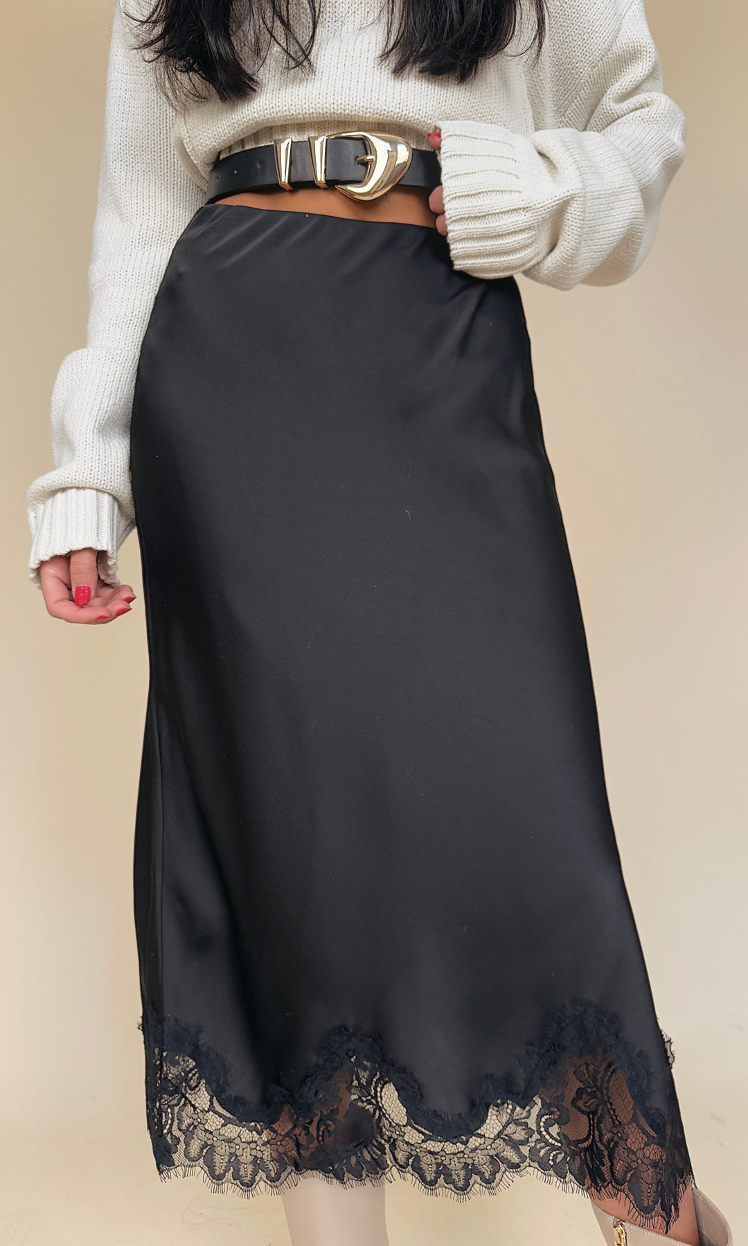 Stunning staple satin midi skirt with lace trim! Pair it with a sweater and a belt for a timeless fall look!