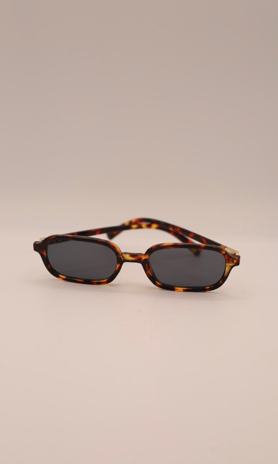Tortoise shell frame style sunnies with gold accents and grey lenses.