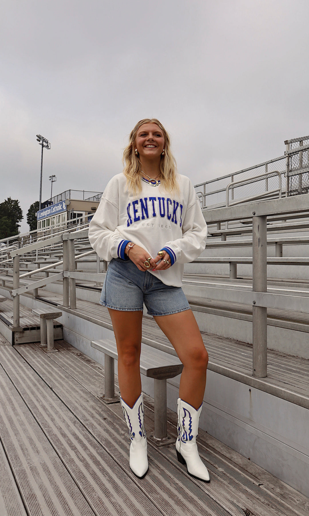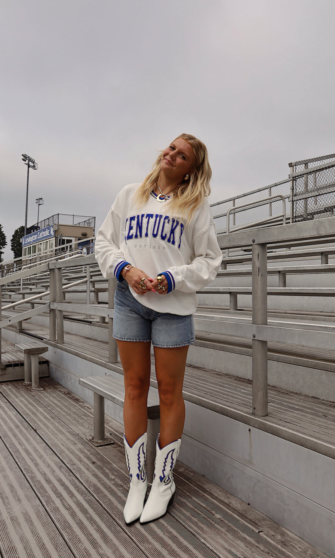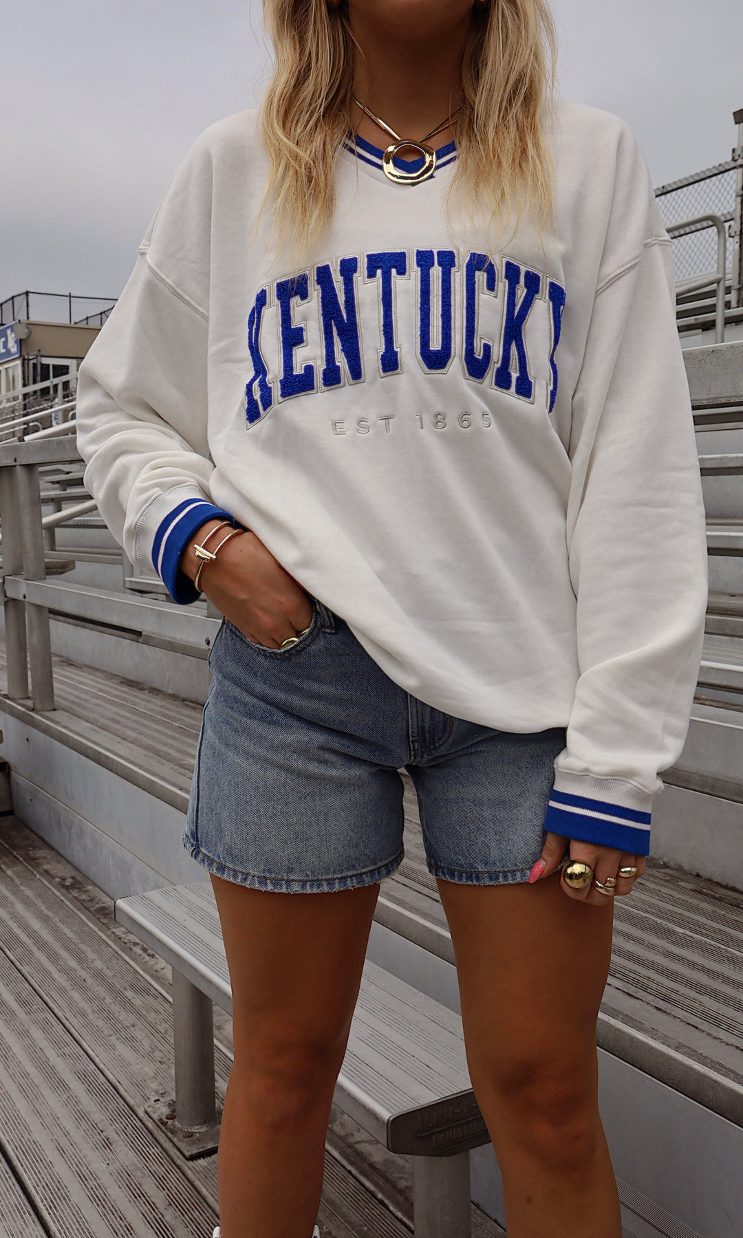 Looking for a new way to rep the cats? This vintage inspired crew with varsity style tipping and an embroidered blue "Kentucky" across the front is just the way to do it.