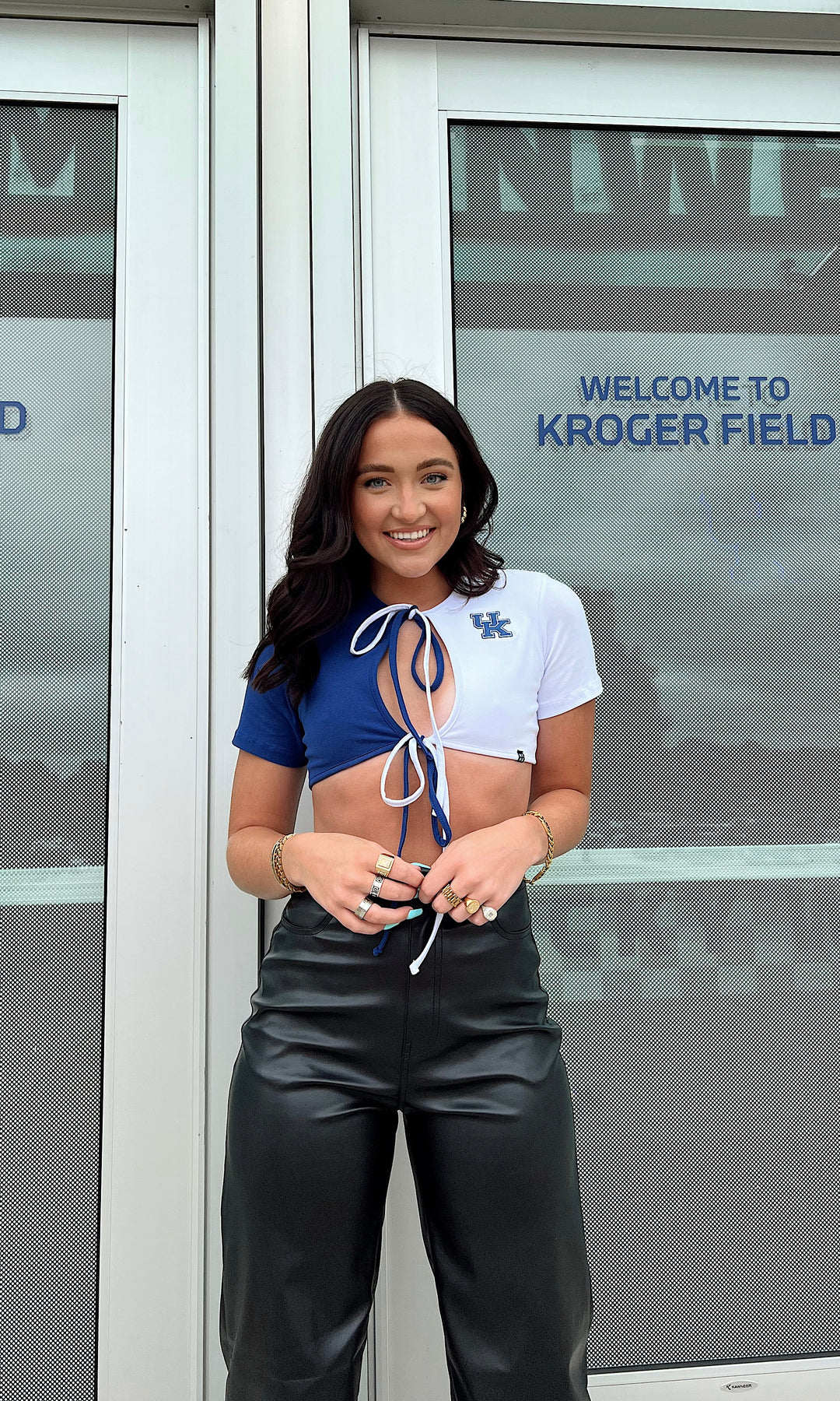 Color block UK blue and white front tie crop top with UK logo in the top corner!