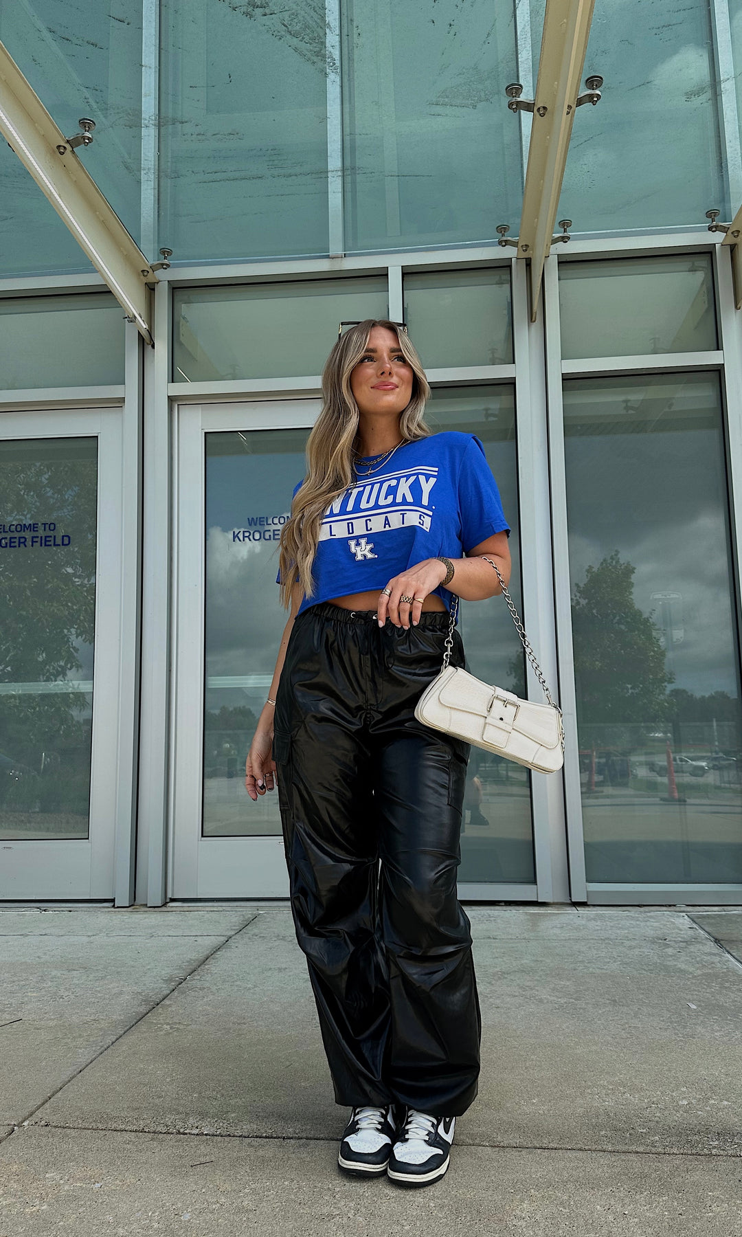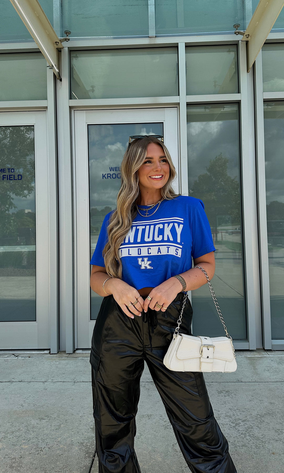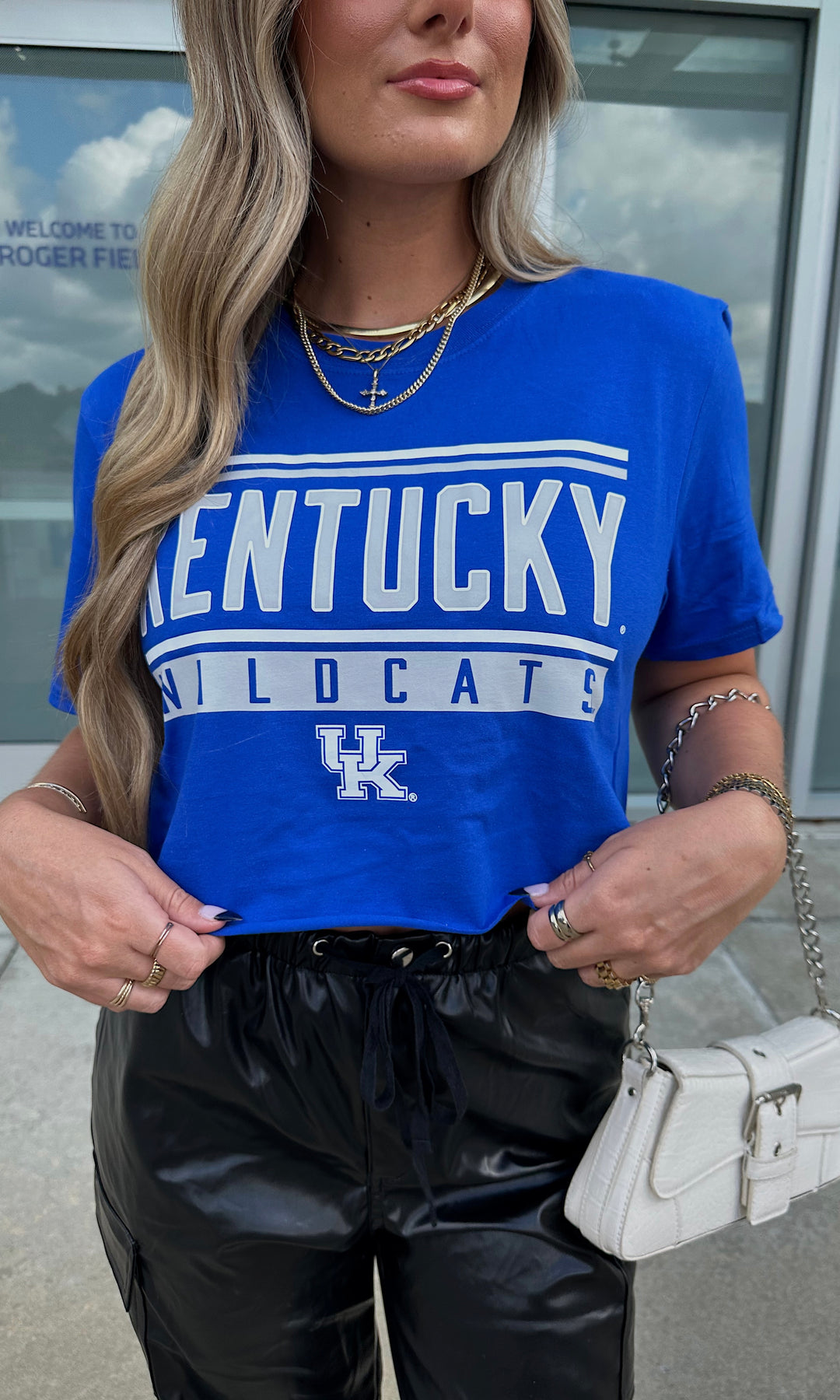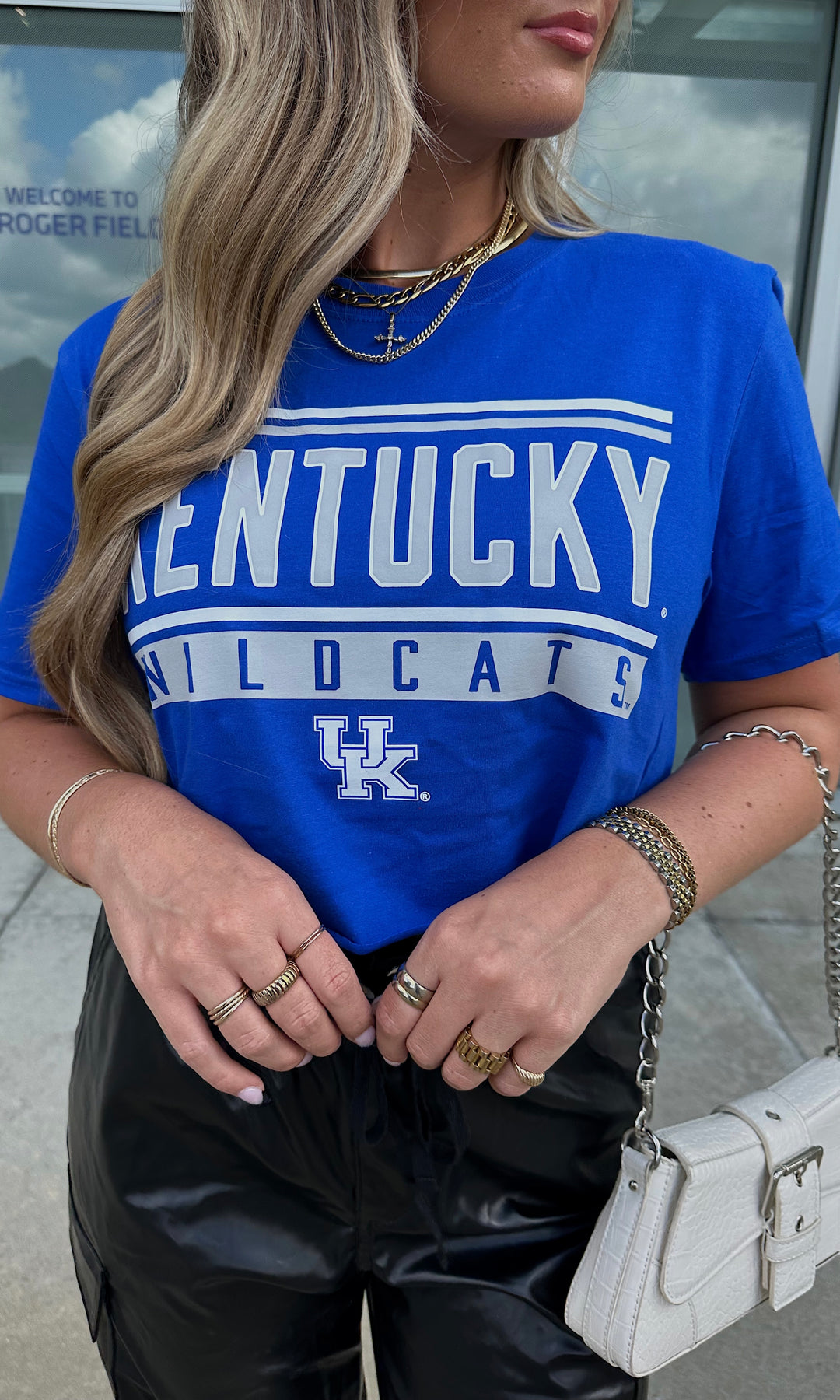 A royal blue tee will never go out of style when cheering on the Kentucky Wildcats! This tee comes cropped or uncropped with a grey & white UK graphic on the chest.